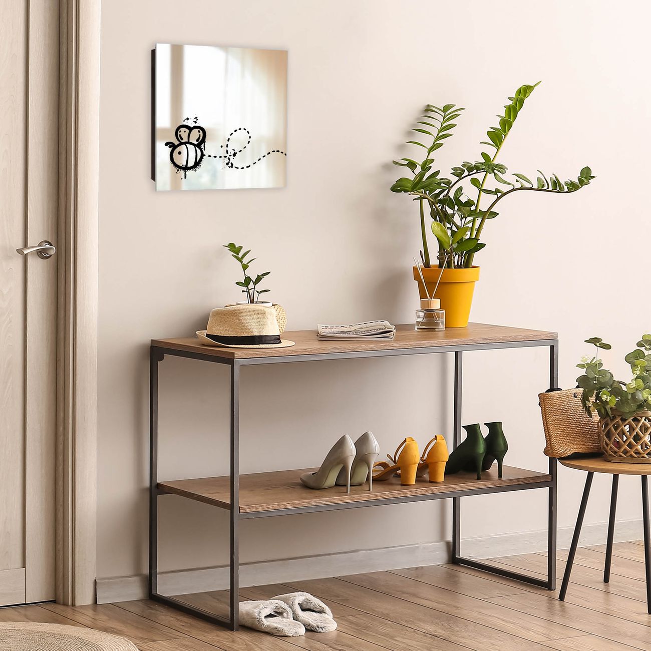 Bringe Ordnung und Stil in deinen Eingangsbereich mit dem banjado Schlüsselkasten mit Spiegel. Die elegante Spiegelfront kombiniert Funktionalität mit modernem Design und macht die Schlüsselaufbewahrung zu einem dekorativen Highlight. ✅ Spiegel Schlüsselaufbewahrung mit Motiv Motiv Fliegende Biene Der Design-Schlüsselkasten Motiv Motiv Fliegende Biene bietet Platz für bis zu 50 Schlüssel, die auf 5 stabilen Reihen mit je 10 Haken übersichtlich verstaut werden. Mit seinen kompakten Maßen von 30 x 30 x 5 cm passt die Schlüsselbox perfekt auch in kleinere Räume. Der schwarz lackierte Stahlkorpus mit rechts angeschlagenem Türscharnier harmoniert mit der Spiegelfront und fügt sich nahtlos in jedes Wohnambiente ein. Ob als Schlüsselorganizer für Zuhause oder als praktische Lösung für Büros, Praxen und Gewerbe, der banjado Schlüsselkasten sorgt für Ordnung und Übersicht. Die Spiegelfront verleiht dem Eingangsbereich zusätzliche Funktionalität und lässt Räume optisch größer wirken. Die Schlüsselbox Motiv Motiv Fliegende Biene zur Wandmontage wird inklusive Befestigungsmaterial geliefert und ist schnell angebracht. So hast du deine Schlüssel jederzeit griffbereit und zugleich stilvoll verstaut. Mit diesem banjado Schlüsselkasten Motiv Motiv Fliegende Biene kombinierst du praktische Aufbewahrung mit stilvollem Wohndesign. Ob privat oder geschäftlich, die Schlüsselbox sorgt für mehr Ordnung, Übersicht und ein wohnliches Ambiente.Vorteile im Überblick