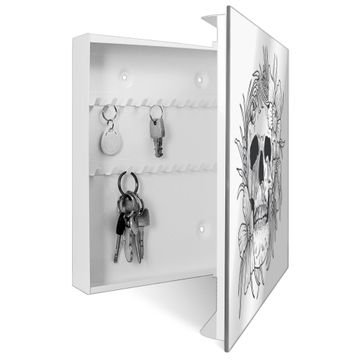 Bringe Ordnung und Stil in deinen Eingangsbereich mit dem banjado Schlüsselkasten mit Spiegel. Die elegante Spiegelfront kombiniert Funktionalität mit modernem Design und macht die Schlüsselaufbewahrung zu einem dekorativen Highlight. ✅ Spiegel Schlüsselaufbewahrung mit Motiv Motiv Floral Skull 2 Der Design-Schlüsselkasten Motiv Motiv Floral Skull 2 bietet Platz für bis zu 50 Schlüssel, die auf 5 stabilen Reihen mit je 10 Haken übersichtlich verstaut werden. Mit seinen kompakten Maßen von 30 x 30 x 5 cm passt die Schlüsselbox perfekt auch in kleinere Räume. Der weiß lackierte Stahlkorpus mit rechts angeschlagenem Türscharnier harmoniert mit der Spiegelfront und fügt sich nahtlos in jedes Wohnambiente ein. Ob als Schlüsselorganizer für Zuhause oder als praktische Lösung für Büros, Praxen und Gewerbe, der banjado Schlüsselkasten sorgt für Ordnung und Übersicht. Die Spiegelfront verleiht dem Eingangsbereich zusätzliche Funktionalität und lässt Räume optisch größer wirken. Die Schlüsselbox Motiv Motiv Floral Skull 2 zur Wandmontage wird inklusive Befestigungsmaterial geliefert und ist schnell angebracht. So hast du deine Schlüssel jederzeit griffbereit und zugleich stilvoll verstaut. Mit diesem banjado Schlüsselkasten Motiv Motiv Floral Skull 2 kombinierst du praktische Aufbewahrung mit stilvollem Wohndesign. Ob privat oder geschäftlich, die Schlüsselbox sorgt für mehr Ordnung, Übersicht und ein wohnliches Ambiente.Vorteile im Überblick