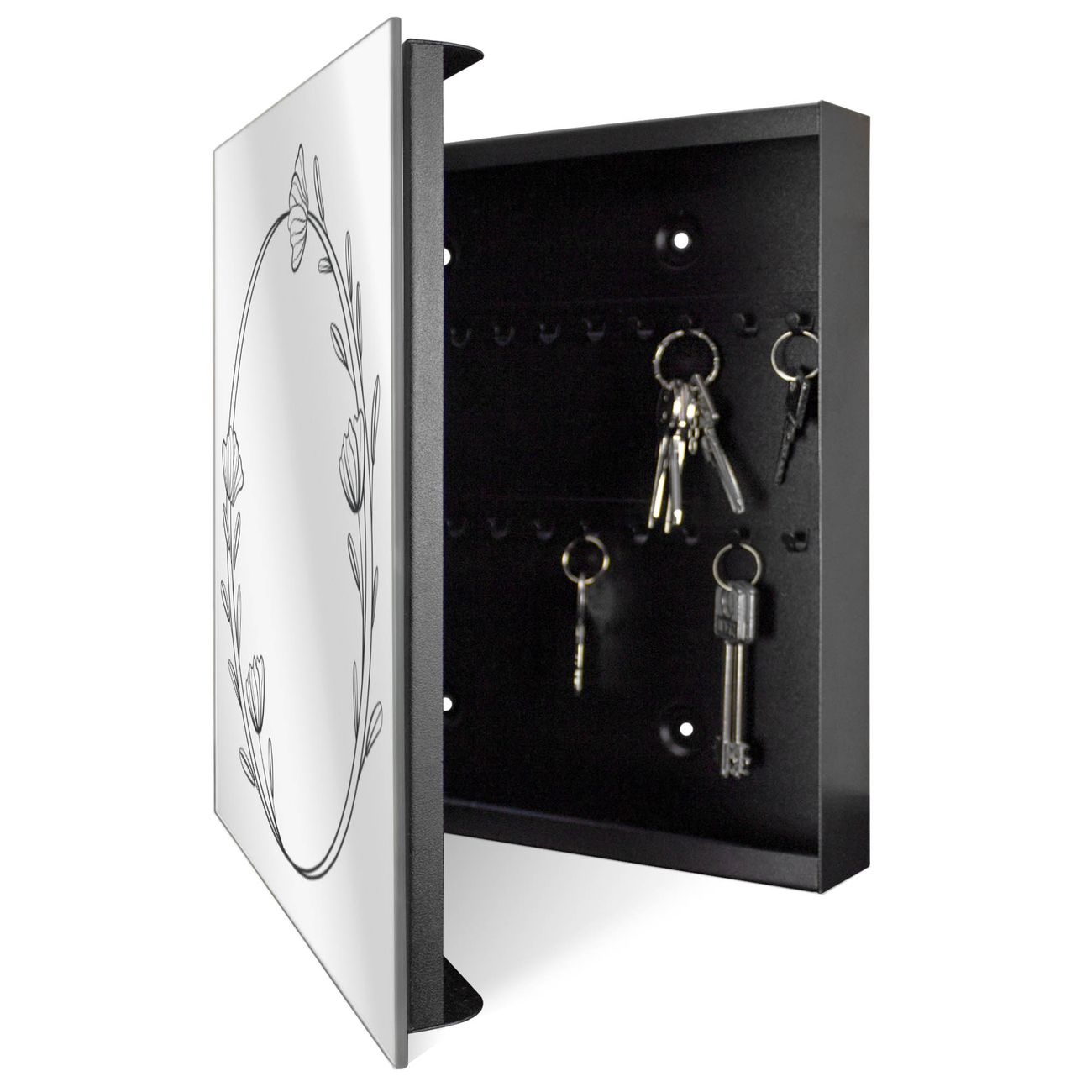 Bringe Ordnung und Stil in deinen Eingangsbereich mit dem banjado Schlüsselkasten mit Spiegel. Die elegante Spiegelfront kombiniert Funktionalität mit modernem Design und macht die Schlüsselaufbewahrung zu einem dekorativen Highlight. ✅ Spiegel Schlüsselaufbewahrung mit Motiv Motiv Florale Eleganz 3 Der Design-Schlüsselkasten Motiv Motiv Florale Eleganz 3 bietet Platz für bis zu 50 Schlüssel, die auf 5 stabilen Reihen mit je 10 Haken übersichtlich verstaut werden. Mit seinen kompakten Maßen von 30 x 30 x 5 cm passt die Schlüsselbox perfekt auch in kleinere Räume. Der schwarz lackierte Stahlkorpus mit rechts angeschlagenem Türscharnier harmoniert mit der Spiegelfront und fügt sich nahtlos in jedes Wohnambiente ein. Ob als Schlüsselorganizer für Zuhause oder als praktische Lösung für Büros, Praxen und Gewerbe, der banjado Schlüsselkasten sorgt für Ordnung und Übersicht. Die Spiegelfront verleiht dem Eingangsbereich zusätzliche Funktionalität und lässt Räume optisch größer wirken. Die Schlüsselbox Motiv Motiv Florale Eleganz 3 zur Wandmontage wird inklusive Befestigungsmaterial geliefert und ist schnell angebracht. So hast du deine Schlüssel jederzeit griffbereit und zugleich stilvoll verstaut. Mit diesem banjado Schlüsselkasten Motiv Motiv Florale Eleganz 3 kombinierst du praktische Aufbewahrung mit stilvollem Wohndesign. Ob privat oder geschäftlich, die Schlüsselbox sorgt für mehr Ordnung, Übersicht und ein wohnliches Ambiente.Vorteile im Überblick