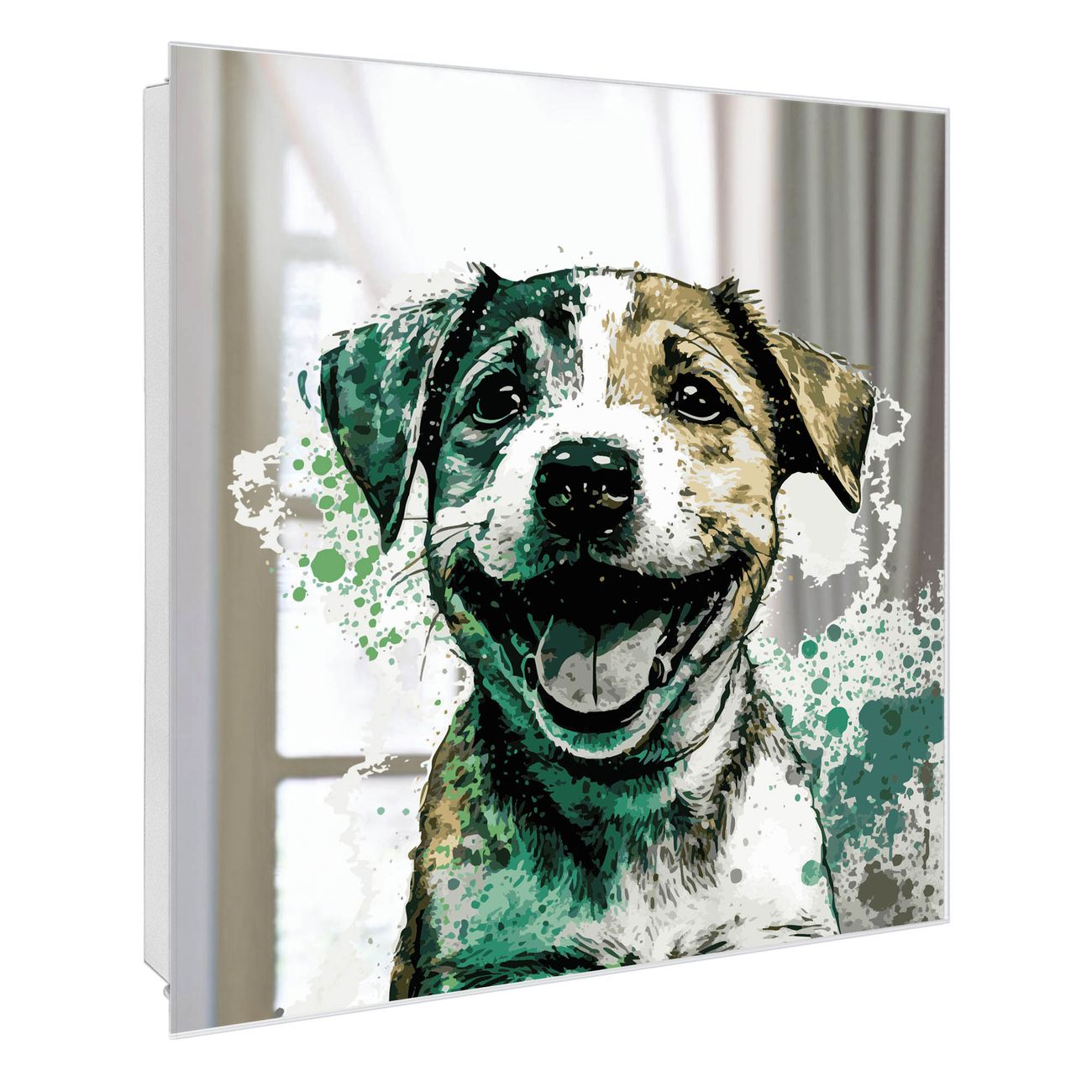 Bringe Ordnung und Stil in deinen Eingangsbereich mit dem banjado Schlüsselkasten mit Spiegel. Die elegante Spiegelfront kombiniert Funktionalität mit modernem Design und macht die Schlüsselaufbewahrung zu einem dekorativen Highlight. ✅ Spiegel Schlüsselaufbewahrung mit Motiv Motiv Fröhlicher Welpe Der Design-Schlüsselkasten Motiv Motiv Fröhlicher Welpe bietet Platz für bis zu 50 Schlüssel, die auf 5 stabilen Reihen mit je 10 Haken übersichtlich verstaut werden. Mit seinen kompakten Maßen von 30 x 30 x 5 cm passt die Schlüsselbox perfekt auch in kleinere Räume. Der weiß lackierte Stahlkorpus mit rechts angeschlagenem Türscharnier harmoniert mit der Spiegelfront und fügt sich nahtlos in jedes Wohnambiente ein. Ob als Schlüsselorganizer für Zuhause oder als praktische Lösung für Büros, Praxen und Gewerbe, der banjado Schlüsselkasten sorgt für Ordnung und Übersicht. Die Spiegelfront verleiht dem Eingangsbereich zusätzliche Funktionalität und lässt Räume optisch größer wirken. Die Schlüsselbox Motiv Motiv Fröhlicher Welpe zur Wandmontage wird inklusive Befestigungsmaterial geliefert und ist schnell angebracht. So hast du deine Schlüssel jederzeit griffbereit und zugleich stilvoll verstaut. Mit diesem banjado Schlüsselkasten Motiv Motiv Fröhlicher Welpe kombinierst du praktische Aufbewahrung mit stilvollem Wohndesign. Ob privat oder geschäftlich, die Schlüsselbox sorgt für mehr Ordnung, Übersicht und ein wohnliches Ambiente.Vorteile im Überblick