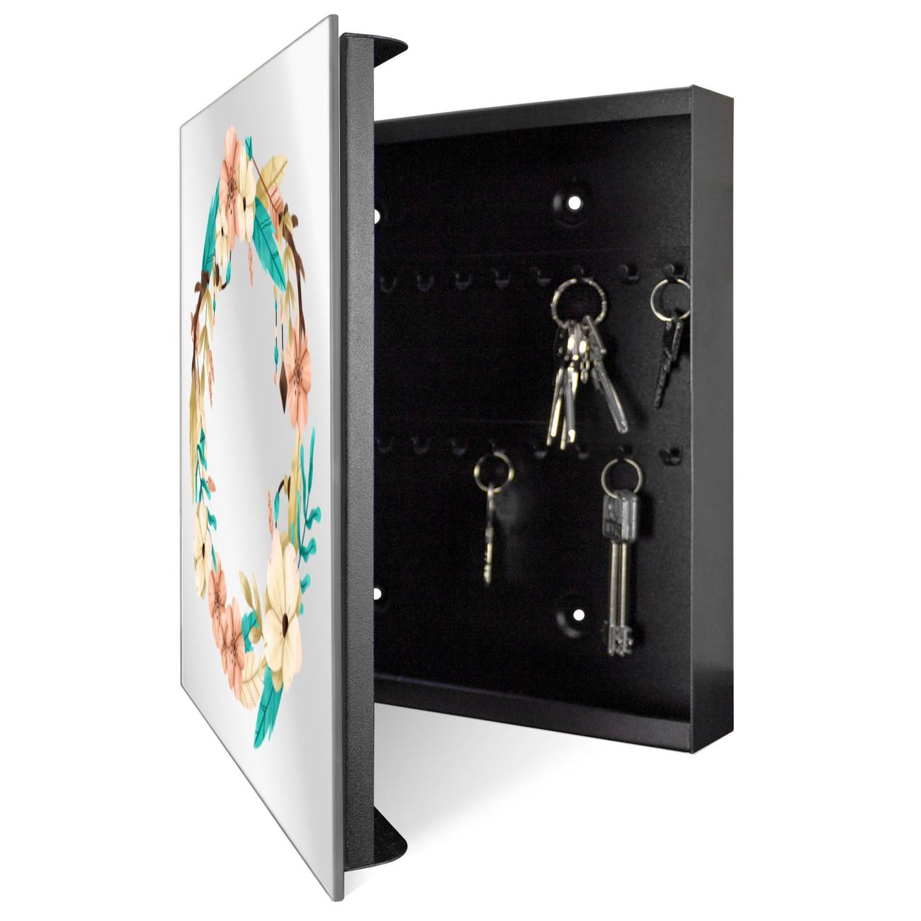 Bringe Ordnung und Stil in deinen Eingangsbereich mit dem banjado Schlüsselkasten mit Spiegel. Die elegante Spiegelfront kombiniert Funktionalität mit modernem Design und macht die Schlüsselaufbewahrung zu einem dekorativen Highlight. ✅ Spiegel Schlüsselaufbewahrung mit Motiv Motiv Frühlingsblütenkranz Der Design-Schlüsselkasten Motiv Motiv Frühlingsblütenkranz bietet Platz für bis zu 50 Schlüssel, die auf 5 stabilen Reihen mit je 10 Haken übersichtlich verstaut werden. Mit seinen kompakten Maßen von 30 x 30 x 5 cm passt die Schlüsselbox perfekt auch in kleinere Räume. Der schwarz lackierte Stahlkorpus mit rechts angeschlagenem Türscharnier harmoniert mit der Spiegelfront und fügt sich nahtlos in jedes Wohnambiente ein. Ob als Schlüsselorganizer für Zuhause oder als praktische Lösung für Büros, Praxen und Gewerbe, der banjado Schlüsselkasten sorgt für Ordnung und Übersicht. Die Spiegelfront verleiht dem Eingangsbereich zusätzliche Funktionalität und lässt Räume optisch größer wirken. Die Schlüsselbox Motiv Motiv Frühlingsblütenkranz zur Wandmontage wird inklusive Befestigungsmaterial geliefert und ist schnell angebracht. So hast du deine Schlüssel jederzeit griffbereit und zugleich stilvoll verstaut. Mit diesem banjado Schlüsselkasten Motiv Motiv Frühlingsblütenkranz kombinierst du praktische Aufbewahrung mit stilvollem Wohndesign. Ob privat oder geschäftlich, die Schlüsselbox sorgt für mehr Ordnung, Übersicht und ein wohnliches Ambiente.Vorteile im Überblick