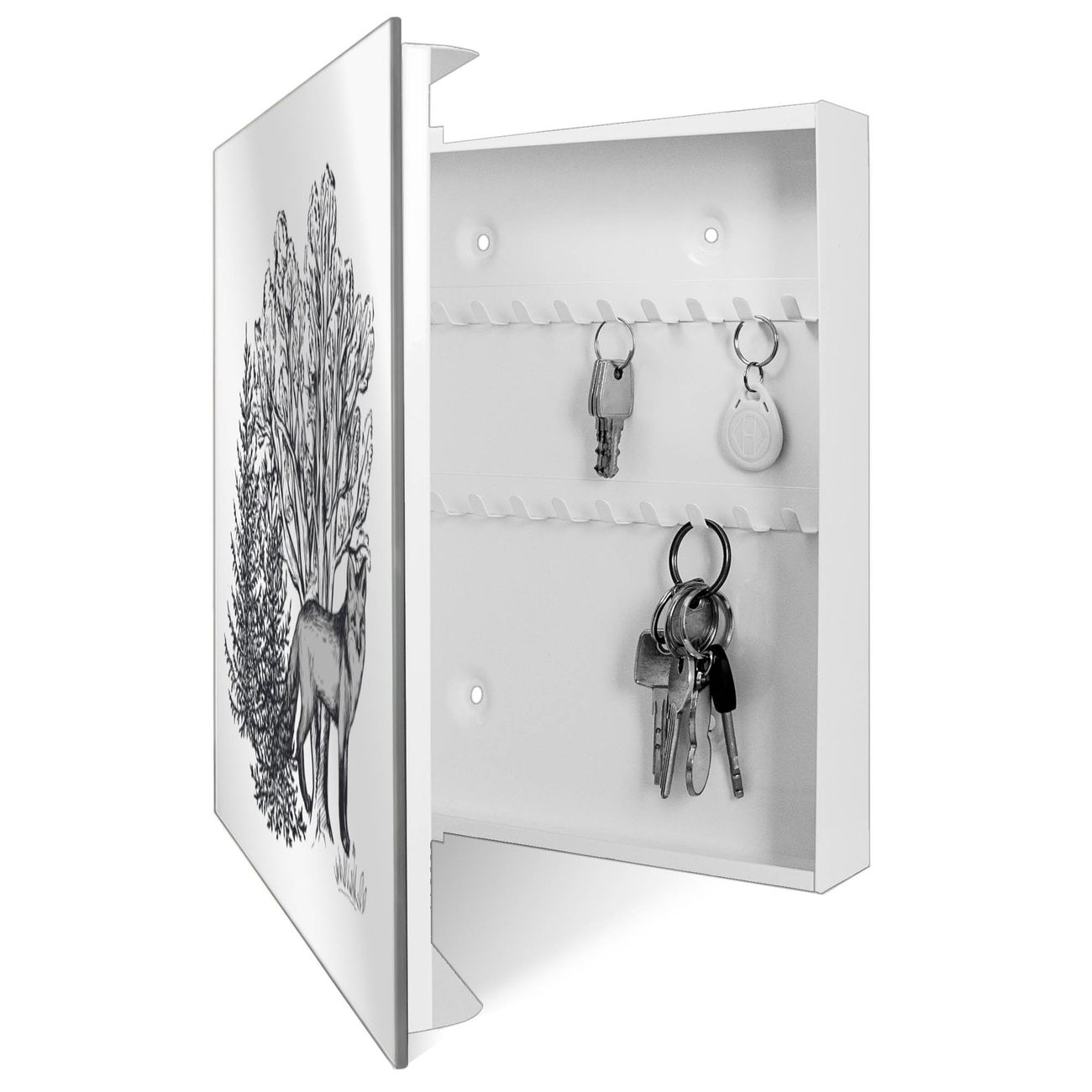 Bringe Ordnung und Stil in deinen Eingangsbereich mit dem banjado Schlüsselkasten mit Spiegel. Die elegante Spiegelfront kombiniert Funktionalität mit modernem Design und macht die Schlüsselaufbewahrung zu einem dekorativen Highlight. ✅ Spiegel Schlüsselaufbewahrung mit Motiv Motiv Fuchs im Wald Der Design-Schlüsselkasten Motiv Motiv Fuchs im Wald bietet Platz für bis zu 50 Schlüssel, die auf 5 stabilen Reihen mit je 10 Haken übersichtlich verstaut werden. Mit seinen kompakten Maßen von 30 x 30 x 5 cm passt die Schlüsselbox perfekt auch in kleinere Räume. Der weiß lackierte Stahlkorpus mit rechts angeschlagenem Türscharnier harmoniert mit der Spiegelfront und fügt sich nahtlos in jedes Wohnambiente ein. Ob als Schlüsselorganizer für Zuhause oder als praktische Lösung für Büros, Praxen und Gewerbe, der banjado Schlüsselkasten sorgt für Ordnung und Übersicht. Die Spiegelfront verleiht dem Eingangsbereich zusätzliche Funktionalität und lässt Räume optisch größer wirken. Die Schlüsselbox Motiv Motiv Fuchs im Wald zur Wandmontage wird inklusive Befestigungsmaterial geliefert und ist schnell angebracht. So hast du deine Schlüssel jederzeit griffbereit und zugleich stilvoll verstaut. Mit diesem banjado Schlüsselkasten Motiv Motiv Fuchs im Wald kombinierst du praktische Aufbewahrung mit stilvollem Wohndesign. Ob privat oder geschäftlich, die Schlüsselbox sorgt für mehr Ordnung, Übersicht und ein wohnliches Ambiente.Vorteile im Überblick