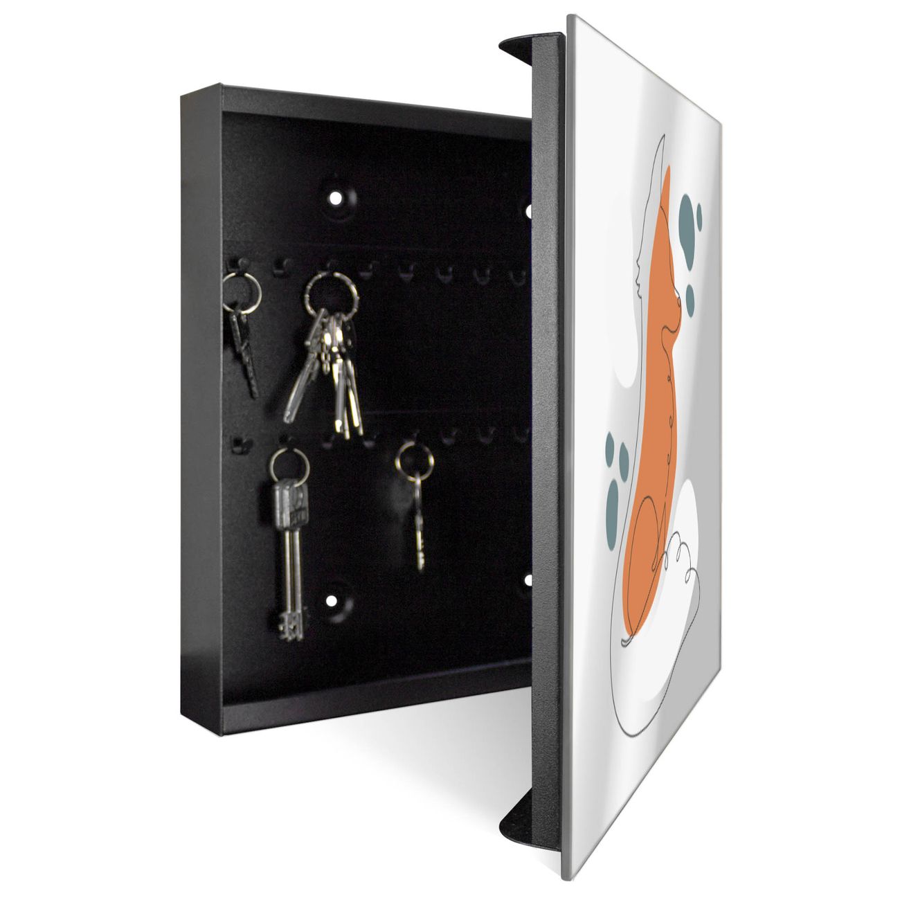 Bringe Ordnung und Stil in deinen Eingangsbereich mit dem banjado Schlüsselkasten mit Spiegel. Die elegante Spiegelfront kombiniert Funktionalität mit modernem Design und macht die Schlüsselaufbewahrung zu einem dekorativen Highlight. ✅ Spiegel Schlüsselaufbewahrung mit Motiv Motiv Fuchs in Linien Der Design-Schlüsselkasten Motiv Motiv Fuchs in Linien bietet Platz für bis zu 50 Schlüssel, die auf 5 stabilen Reihen mit je 10 Haken übersichtlich verstaut werden. Mit seinen kompakten Maßen von 30 x 30 x 5 cm passt die Schlüsselbox perfekt auch in kleinere Räume. Der schwarz lackierte Stahlkorpus mit rechts angeschlagenem Türscharnier harmoniert mit der Spiegelfront und fügt sich nahtlos in jedes Wohnambiente ein. Ob als Schlüsselorganizer für Zuhause oder als praktische Lösung für Büros, Praxen und Gewerbe, der banjado Schlüsselkasten sorgt für Ordnung und Übersicht. Die Spiegelfront verleiht dem Eingangsbereich zusätzliche Funktionalität und lässt Räume optisch größer wirken. Die Schlüsselbox Motiv Motiv Fuchs in Linien zur Wandmontage wird inklusive Befestigungsmaterial geliefert und ist schnell angebracht. So hast du deine Schlüssel jederzeit griffbereit und zugleich stilvoll verstaut. Mit diesem banjado Schlüsselkasten Motiv Motiv Fuchs in Linien kombinierst du praktische Aufbewahrung mit stilvollem Wohndesign. Ob privat oder geschäftlich, die Schlüsselbox sorgt für mehr Ordnung, Übersicht und ein wohnliches Ambiente.Vorteile im Überblick