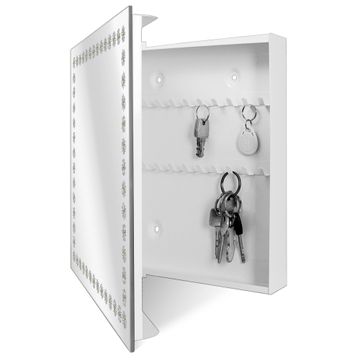 Bringe Ordnung und Stil in deinen Eingangsbereich mit dem banjado Schlüsselkasten mit Spiegel. Die elegante Spiegelfront kombiniert Funktionalität mit modernem Design und macht die Schlüsselaufbewahrung zu einem dekorativen Highlight. ✅ Spiegel Schlüsselaufbewahrung mit Motiv Motiv Gänseblümchen-Rahmen Der Design-Schlüsselkasten Motiv Motiv Gänseblümchen-Rahmen bietet Platz für bis zu 50 Schlüssel, die auf 5 stabilen Reihen mit je 10 Haken übersichtlich verstaut werden. Mit seinen kompakten Maßen von 30 x 30 x 5 cm passt die Schlüsselbox perfekt auch in kleinere Räume. Der weiß lackierte Stahlkorpus mit rechts angeschlagenem Türscharnier harmoniert mit der Spiegelfront und fügt sich nahtlos in jedes Wohnambiente ein. Ob als Schlüsselorganizer für Zuhause oder als praktische Lösung für Büros, Praxen und Gewerbe, der banjado Schlüsselkasten sorgt für Ordnung und Übersicht. Die Spiegelfront verleiht dem Eingangsbereich zusätzliche Funktionalität und lässt Räume optisch größer wirken. Die Schlüsselbox Motiv Motiv Gänseblümchen-Rahmen zur Wandmontage wird inklusive Befestigungsmaterial geliefert und ist schnell angebracht. So hast du deine Schlüssel jederzeit griffbereit und zugleich stilvoll verstaut. Mit diesem banjado Schlüsselkasten Motiv Motiv Gänseblümchen-Rahmen kombinierst du praktische Aufbewahrung mit stilvollem Wohndesign. Ob privat oder geschäftlich, die Schlüsselbox sorgt für mehr Ordnung, Übersicht und ein wohnliches Ambiente.Vorteile im Überblick