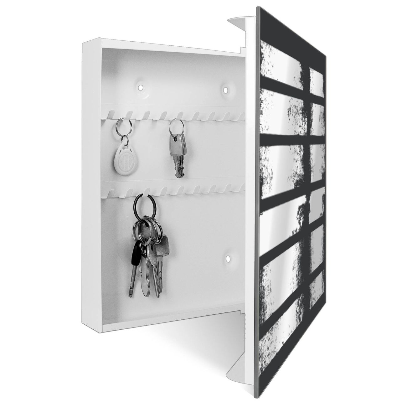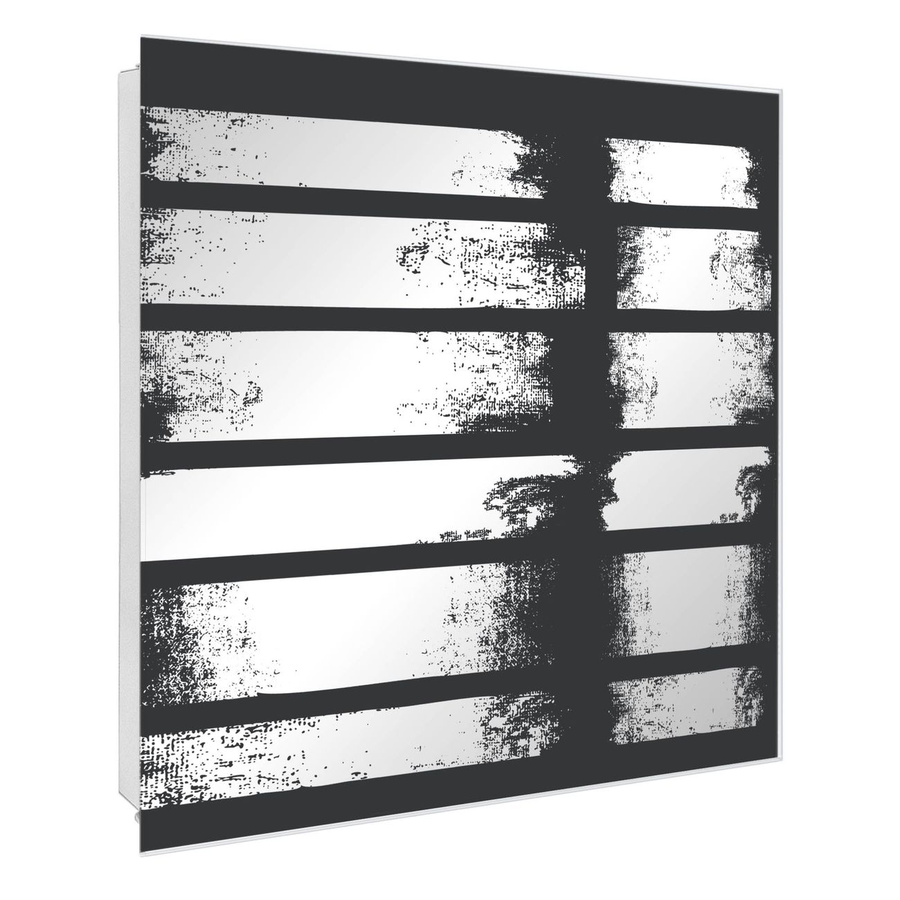 Bringe Ordnung und Stil in deinen Eingangsbereich mit dem banjado Schlüsselkasten mit Spiegel. Die elegante Spiegelfront kombiniert Funktionalität mit modernem Design und macht die Schlüsselaufbewahrung zu einem dekorativen Highlight. ✅ Spiegel Schlüsselaufbewahrung mit Motiv Motiv Grunge Streifen Der Design-Schlüsselkasten Motiv Motiv Grunge Streifen bietet Platz für bis zu 50 Schlüssel, die auf 5 stabilen Reihen mit je 10 Haken übersichtlich verstaut werden. Mit seinen kompakten Maßen von 30 x 30 x 5 cm passt die Schlüsselbox perfekt auch in kleinere Räume. Der weiß lackierte Stahlkorpus mit rechts angeschlagenem Türscharnier harmoniert mit der Spiegelfront und fügt sich nahtlos in jedes Wohnambiente ein. Ob als Schlüsselorganizer für Zuhause oder als praktische Lösung für Büros, Praxen und Gewerbe, der banjado Schlüsselkasten sorgt für Ordnung und Übersicht. Die Spiegelfront verleiht dem Eingangsbereich zusätzliche Funktionalität und lässt Räume optisch größer wirken. Die Schlüsselbox Motiv Motiv Grunge Streifen zur Wandmontage wird inklusive Befestigungsmaterial geliefert und ist schnell angebracht. So hast du deine Schlüssel jederzeit griffbereit und zugleich stilvoll verstaut. Mit diesem banjado Schlüsselkasten Motiv Motiv Grunge Streifen kombinierst du praktische Aufbewahrung mit stilvollem Wohndesign. Ob privat oder geschäftlich, die Schlüsselbox sorgt für mehr Ordnung, Übersicht und ein wohnliches Ambiente.Vorteile im Überblick