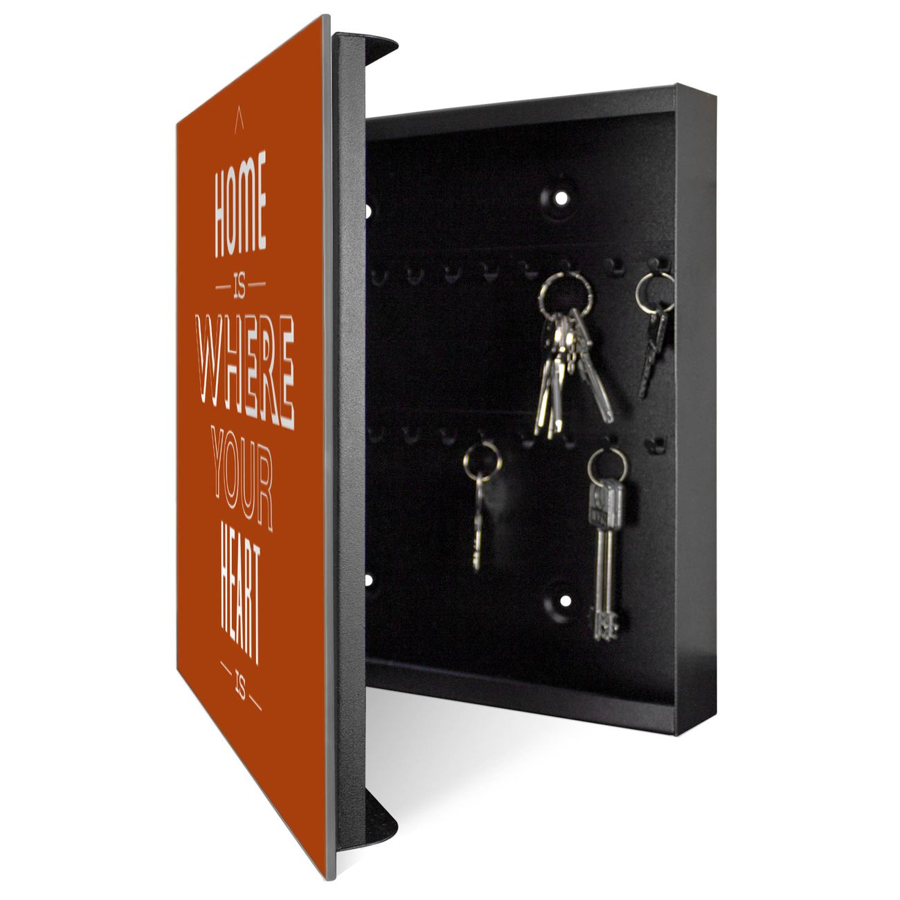 Bringe Ordnung und Stil in deinen Eingangsbereich mit dem banjado Schlüsselkasten mit Spiegel. Die elegante Spiegelfront kombiniert Funktionalität mit modernem Design und macht die Schlüsselaufbewahrung zu einem dekorativen Highlight. ✅ Spiegel Schlüsselaufbewahrung mit Motiv Motiv Heimatliebe 2 Der Design-Schlüsselkasten Motiv Motiv Heimatliebe 2 bietet Platz für bis zu 50 Schlüssel, die auf 5 stabilen Reihen mit je 10 Haken übersichtlich verstaut werden. Mit seinen kompakten Maßen von 30 x 30 x 5 cm passt die Schlüsselbox perfekt auch in kleinere Räume. Der schwarz lackierte Stahlkorpus mit rechts angeschlagenem Türscharnier harmoniert mit der Spiegelfront und fügt sich nahtlos in jedes Wohnambiente ein. Ob als Schlüsselorganizer für Zuhause oder als praktische Lösung für Büros, Praxen und Gewerbe, der banjado Schlüsselkasten sorgt für Ordnung und Übersicht. Die Spiegelfront verleiht dem Eingangsbereich zusätzliche Funktionalität und lässt Räume optisch größer wirken. Die Schlüsselbox Motiv Motiv Heimatliebe 2 zur Wandmontage wird inklusive Befestigungsmaterial geliefert und ist schnell angebracht. So hast du deine Schlüssel jederzeit griffbereit und zugleich stilvoll verstaut. Mit diesem banjado Schlüsselkasten Motiv Motiv Heimatliebe 2 kombinierst du praktische Aufbewahrung mit stilvollem Wohndesign. Ob privat oder geschäftlich, die Schlüsselbox sorgt für mehr Ordnung, Übersicht und ein wohnliches Ambiente.Vorteile im Überblick
