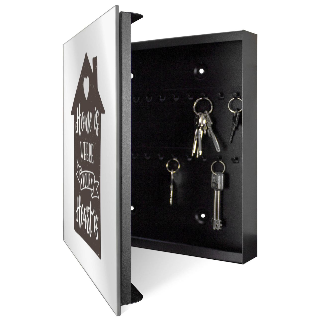 Bringe Ordnung und Stil in deinen Eingangsbereich mit dem banjado Schlüsselkasten mit Spiegel. Die elegante Spiegelfront kombiniert Funktionalität mit modernem Design und macht die Schlüsselaufbewahrung zu einem dekorativen Highlight. ✅ Spiegel Schlüsselaufbewahrung mit Motiv Motiv Heimlicher Spruch Der Design-Schlüsselkasten Motiv Motiv Heimlicher Spruch bietet Platz für bis zu 50 Schlüssel, die auf 5 stabilen Reihen mit je 10 Haken übersichtlich verstaut werden. Mit seinen kompakten Maßen von 30 x 30 x 5 cm passt die Schlüsselbox perfekt auch in kleinere Räume. Der schwarz lackierte Stahlkorpus mit rechts angeschlagenem Türscharnier harmoniert mit der Spiegelfront und fügt sich nahtlos in jedes Wohnambiente ein. Ob als Schlüsselorganizer für Zuhause oder als praktische Lösung für Büros, Praxen und Gewerbe, der banjado Schlüsselkasten sorgt für Ordnung und Übersicht. Die Spiegelfront verleiht dem Eingangsbereich zusätzliche Funktionalität und lässt Räume optisch größer wirken. Die Schlüsselbox Motiv Motiv Heimlicher Spruch zur Wandmontage wird inklusive Befestigungsmaterial geliefert und ist schnell angebracht. So hast du deine Schlüssel jederzeit griffbereit und zugleich stilvoll verstaut. Mit diesem banjado Schlüsselkasten Motiv Motiv Heimlicher Spruch kombinierst du praktische Aufbewahrung mit stilvollem Wohndesign. Ob privat oder geschäftlich, die Schlüsselbox sorgt für mehr Ordnung, Übersicht und ein wohnliches Ambiente.Vorteile im Überblick