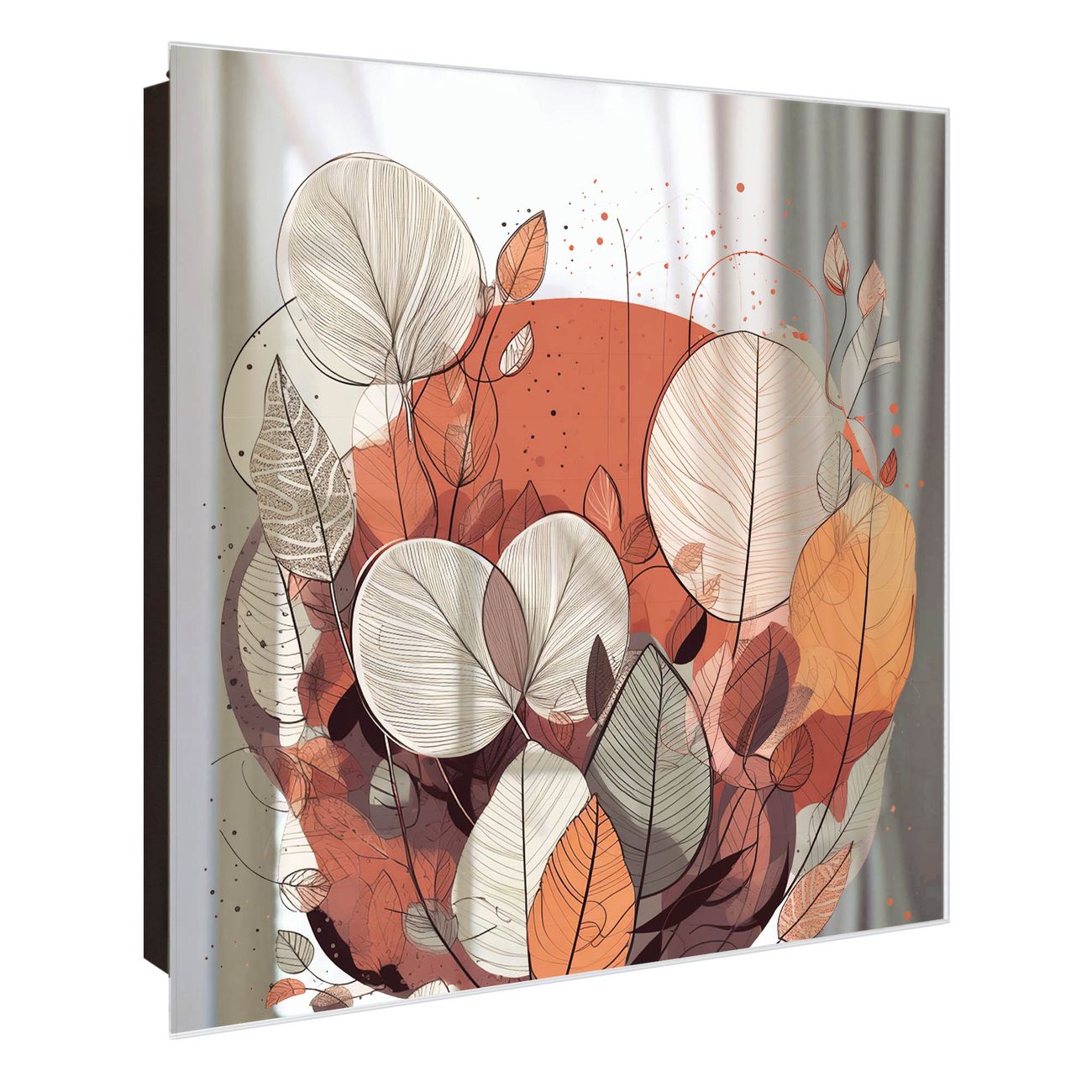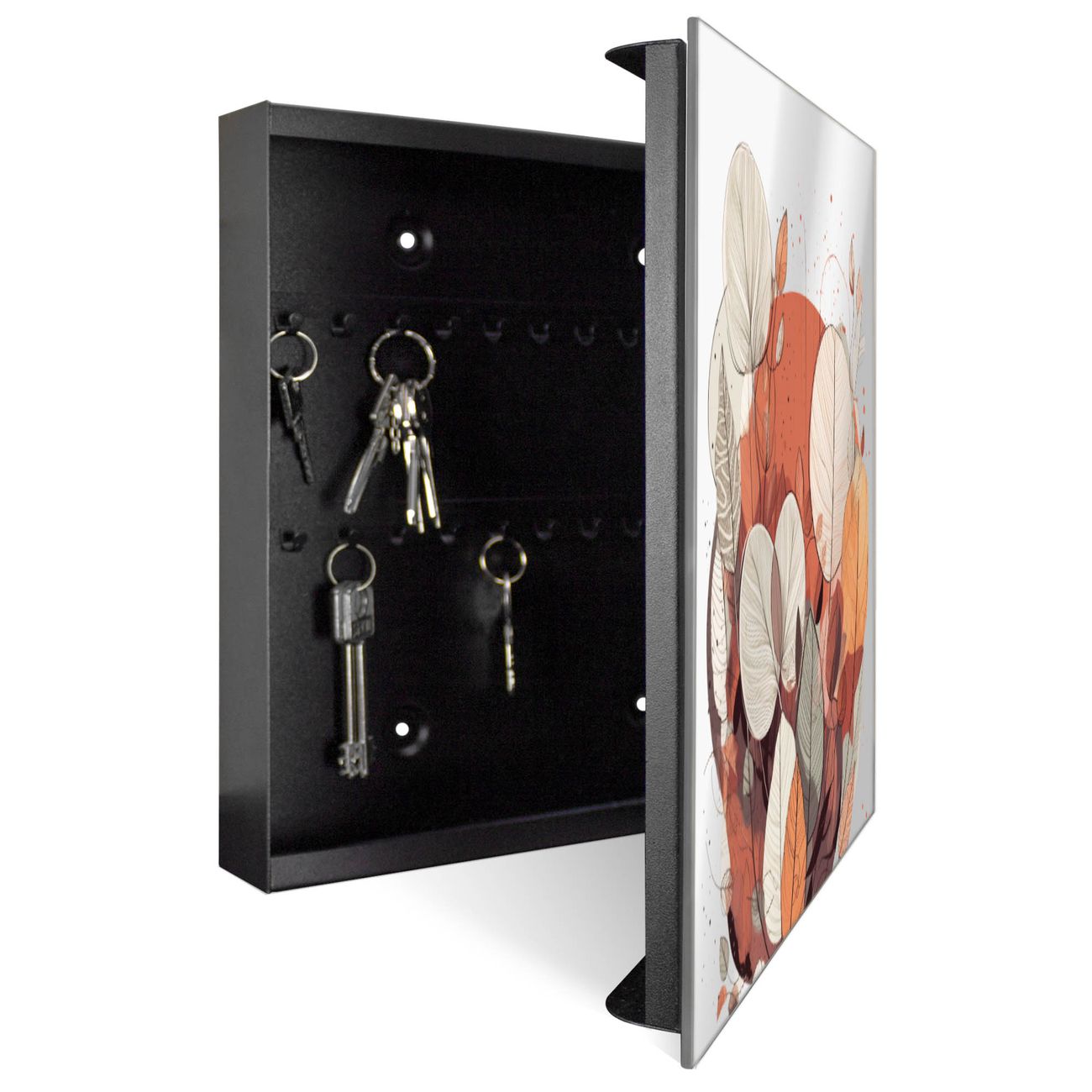 Bringe Ordnung und Stil in deinen Eingangsbereich mit dem banjado Schlüsselkasten mit Spiegel. Die elegante Spiegelfront kombiniert Funktionalität mit modernem Design und macht die Schlüsselaufbewahrung zu einem dekorativen Highlight. ✅ Spiegel Schlüsselaufbewahrung mit Motiv Motiv Herbstliche Blätterpracht Der Design-Schlüsselkasten Motiv Motiv Herbstliche Blätterpracht bietet Platz für bis zu 50 Schlüssel, die auf 5 stabilen Reihen mit je 10 Haken übersichtlich verstaut werden. Mit seinen kompakten Maßen von 30 x 30 x 5 cm passt die Schlüsselbox perfekt auch in kleinere Räume. Der schwarz lackierte Stahlkorpus mit rechts angeschlagenem Türscharnier harmoniert mit der Spiegelfront und fügt sich nahtlos in jedes Wohnambiente ein. Ob als Schlüsselorganizer für Zuhause oder als praktische Lösung für Büros, Praxen und Gewerbe, der banjado Schlüsselkasten sorgt für Ordnung und Übersicht. Die Spiegelfront verleiht dem Eingangsbereich zusätzliche Funktionalität und lässt Räume optisch größer wirken. Die Schlüsselbox Motiv Motiv Herbstliche Blätterpracht zur Wandmontage wird inklusive Befestigungsmaterial geliefert und ist schnell angebracht. So hast du deine Schlüssel jederzeit griffbereit und zugleich stilvoll verstaut. Mit diesem banjado Schlüsselkasten Motiv Motiv Herbstliche Blätterpracht kombinierst du praktische Aufbewahrung mit stilvollem Wohndesign. Ob privat oder geschäftlich, die Schlüsselbox sorgt für mehr Ordnung, Übersicht und ein wohnliches Ambiente.Vorteile im Überblick