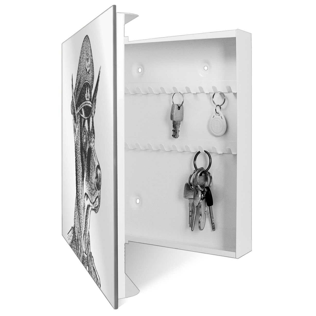 Bringe Ordnung und Stil in deinen Eingangsbereich mit dem banjado Schlüsselkasten mit Spiegel. Die elegante Spiegelfront kombiniert Funktionalität mit modernem Design und macht die Schlüsselaufbewahrung zu einem dekorativen Highlight. ✅ Spiegel Schlüsselaufbewahrung mit Motiv Motiv Herr Hund 2 Der Design-Schlüsselkasten Motiv Motiv Herr Hund 2 bietet Platz für bis zu 50 Schlüssel, die auf 5 stabilen Reihen mit je 10 Haken übersichtlich verstaut werden. Mit seinen kompakten Maßen von 30 x 30 x 5 cm passt die Schlüsselbox perfekt auch in kleinere Räume. Der weiß lackierte Stahlkorpus mit rechts angeschlagenem Türscharnier harmoniert mit der Spiegelfront und fügt sich nahtlos in jedes Wohnambiente ein. Ob als Schlüsselorganizer für Zuhause oder als praktische Lösung für Büros, Praxen und Gewerbe, der banjado Schlüsselkasten sorgt für Ordnung und Übersicht. Die Spiegelfront verleiht dem Eingangsbereich zusätzliche Funktionalität und lässt Räume optisch größer wirken. Die Schlüsselbox Motiv Motiv Herr Hund 2 zur Wandmontage wird inklusive Befestigungsmaterial geliefert und ist schnell angebracht. So hast du deine Schlüssel jederzeit griffbereit und zugleich stilvoll verstaut. Mit diesem banjado Schlüsselkasten Motiv Motiv Herr Hund 2 kombinierst du praktische Aufbewahrung mit stilvollem Wohndesign. Ob privat oder geschäftlich, die Schlüsselbox sorgt für mehr Ordnung, Übersicht und ein wohnliches Ambiente.Vorteile im Überblick