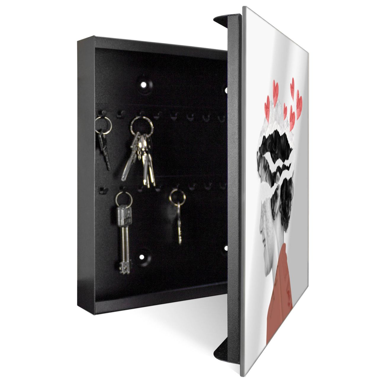 Bringe Ordnung und Stil in deinen Eingangsbereich mit dem banjado Schlüsselkasten mit Spiegel. Die elegante Spiegelfront kombiniert Funktionalität mit modernem Design und macht die Schlüsselaufbewahrung zu einem dekorativen Highlight. ✅ Spiegel Schlüsselaufbewahrung mit Motiv Motiv Herzvoller Gedanke Der Design-Schlüsselkasten Motiv Motiv Herzvoller Gedanke bietet Platz für bis zu 50 Schlüssel, die auf 5 stabilen Reihen mit je 10 Haken übersichtlich verstaut werden. Mit seinen kompakten Maßen von 30 x 30 x 5 cm passt die Schlüsselbox perfekt auch in kleinere Räume. Der schwarz lackierte Stahlkorpus mit rechts angeschlagenem Türscharnier harmoniert mit der Spiegelfront und fügt sich nahtlos in jedes Wohnambiente ein. Ob als Schlüsselorganizer für Zuhause oder als praktische Lösung für Büros, Praxen und Gewerbe, der banjado Schlüsselkasten sorgt für Ordnung und Übersicht. Die Spiegelfront verleiht dem Eingangsbereich zusätzliche Funktionalität und lässt Räume optisch größer wirken. Die Schlüsselbox Motiv Motiv Herzvoller Gedanke zur Wandmontage wird inklusive Befestigungsmaterial geliefert und ist schnell angebracht. So hast du deine Schlüssel jederzeit griffbereit und zugleich stilvoll verstaut. Mit diesem banjado Schlüsselkasten Motiv Motiv Herzvoller Gedanke kombinierst du praktische Aufbewahrung mit stilvollem Wohndesign. Ob privat oder geschäftlich, die Schlüsselbox sorgt für mehr Ordnung, Übersicht und ein wohnliches Ambiente.Vorteile im Überblick