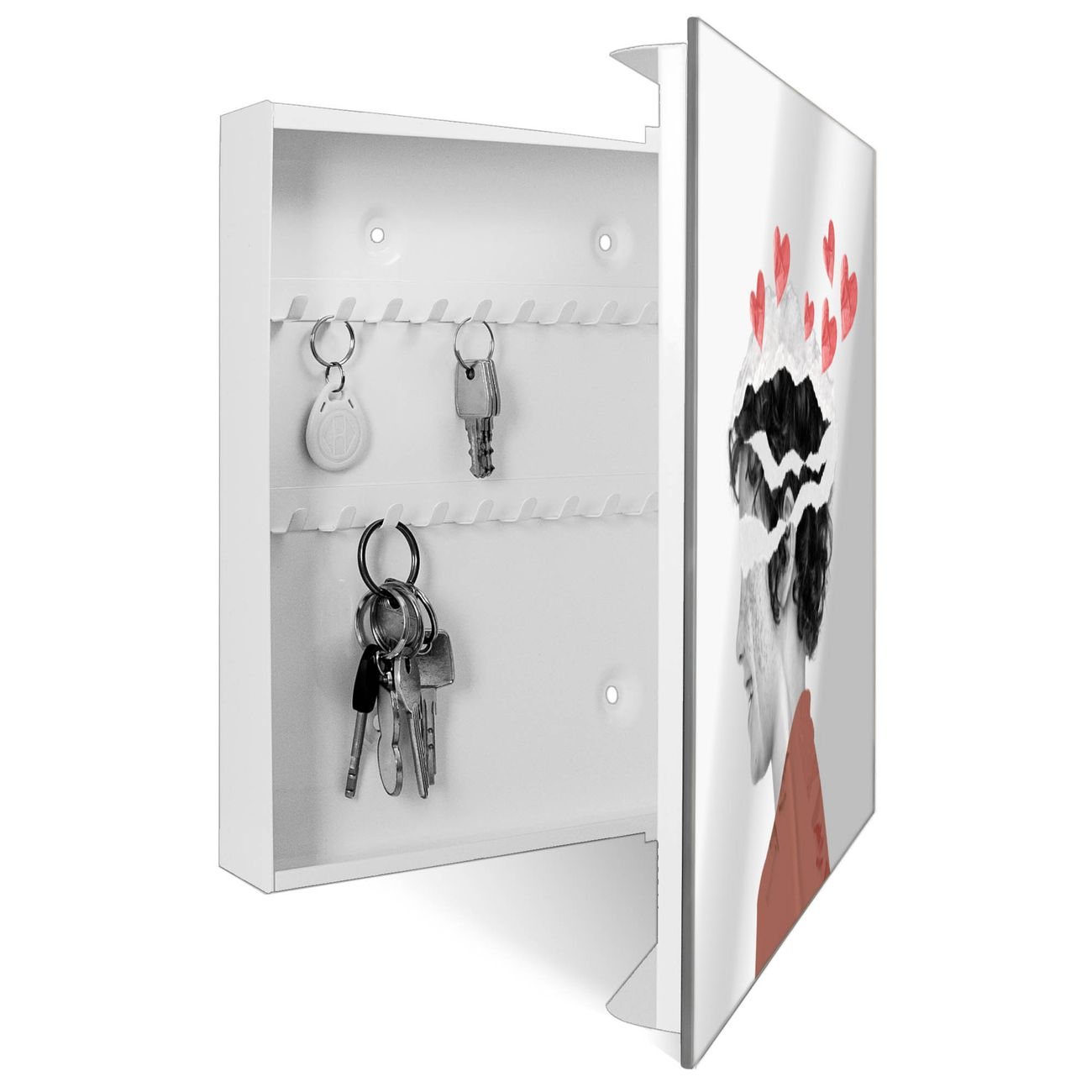 Bringe Ordnung und Stil in deinen Eingangsbereich mit dem banjado Schlüsselkasten mit Spiegel. Die elegante Spiegelfront kombiniert Funktionalität mit modernem Design und macht die Schlüsselaufbewahrung zu einem dekorativen Highlight. ✅ Spiegel Schlüsselaufbewahrung mit Motiv Motiv Herzvoller Gedanke Der Design-Schlüsselkasten Motiv Motiv Herzvoller Gedanke bietet Platz für bis zu 50 Schlüssel, die auf 5 stabilen Reihen mit je 10 Haken übersichtlich verstaut werden. Mit seinen kompakten Maßen von 30 x 30 x 5 cm passt die Schlüsselbox perfekt auch in kleinere Räume. Der weiß lackierte Stahlkorpus mit rechts angeschlagenem Türscharnier harmoniert mit der Spiegelfront und fügt sich nahtlos in jedes Wohnambiente ein. Ob als Schlüsselorganizer für Zuhause oder als praktische Lösung für Büros, Praxen und Gewerbe, der banjado Schlüsselkasten sorgt für Ordnung und Übersicht. Die Spiegelfront verleiht dem Eingangsbereich zusätzliche Funktionalität und lässt Räume optisch größer wirken. Die Schlüsselbox Motiv Motiv Herzvoller Gedanke zur Wandmontage wird inklusive Befestigungsmaterial geliefert und ist schnell angebracht. So hast du deine Schlüssel jederzeit griffbereit und zugleich stilvoll verstaut. Mit diesem banjado Schlüsselkasten Motiv Motiv Herzvoller Gedanke kombinierst du praktische Aufbewahrung mit stilvollem Wohndesign. Ob privat oder geschäftlich, die Schlüsselbox sorgt für mehr Ordnung, Übersicht und ein wohnliches Ambiente.Vorteile im Überblick