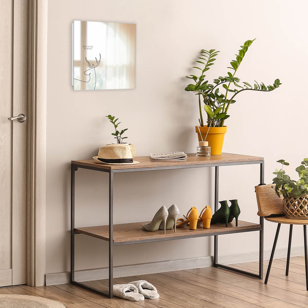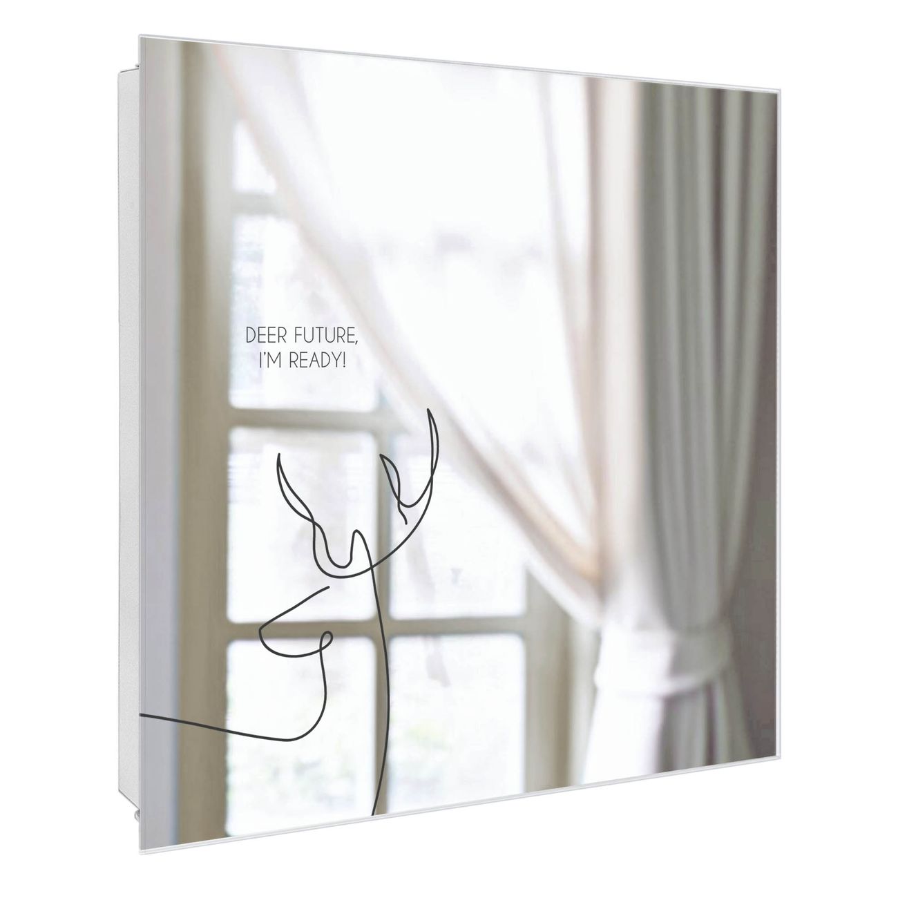 Bringe Ordnung und Stil in deinen Eingangsbereich mit dem banjado Schlüsselkasten mit Spiegel. Die elegante Spiegelfront kombiniert Funktionalität mit modernem Design und macht die Schlüsselaufbewahrung zu einem dekorativen Highlight. ✅ Spiegel Schlüsselaufbewahrung mit Motiv Motiv Hirsch der Zukunft Der Design-Schlüsselkasten Motiv Motiv Hirsch der Zukunft bietet Platz für bis zu 50 Schlüssel, die auf 5 stabilen Reihen mit je 10 Haken übersichtlich verstaut werden. Mit seinen kompakten Maßen von 30 x 30 x 5 cm passt die Schlüsselbox perfekt auch in kleinere Räume. Der weiß lackierte Stahlkorpus mit rechts angeschlagenem Türscharnier harmoniert mit der Spiegelfront und fügt sich nahtlos in jedes Wohnambiente ein. Ob als Schlüsselorganizer für Zuhause oder als praktische Lösung für Büros, Praxen und Gewerbe, der banjado Schlüsselkasten sorgt für Ordnung und Übersicht. Die Spiegelfront verleiht dem Eingangsbereich zusätzliche Funktionalität und lässt Räume optisch größer wirken. Die Schlüsselbox Motiv Motiv Hirsch der Zukunft zur Wandmontage wird inklusive Befestigungsmaterial geliefert und ist schnell angebracht. So hast du deine Schlüssel jederzeit griffbereit und zugleich stilvoll verstaut. Mit diesem banjado Schlüsselkasten Motiv Motiv Hirsch der Zukunft kombinierst du praktische Aufbewahrung mit stilvollem Wohndesign. Ob privat oder geschäftlich, die Schlüsselbox sorgt für mehr Ordnung, Übersicht und ein wohnliches Ambiente.Vorteile im Überblick