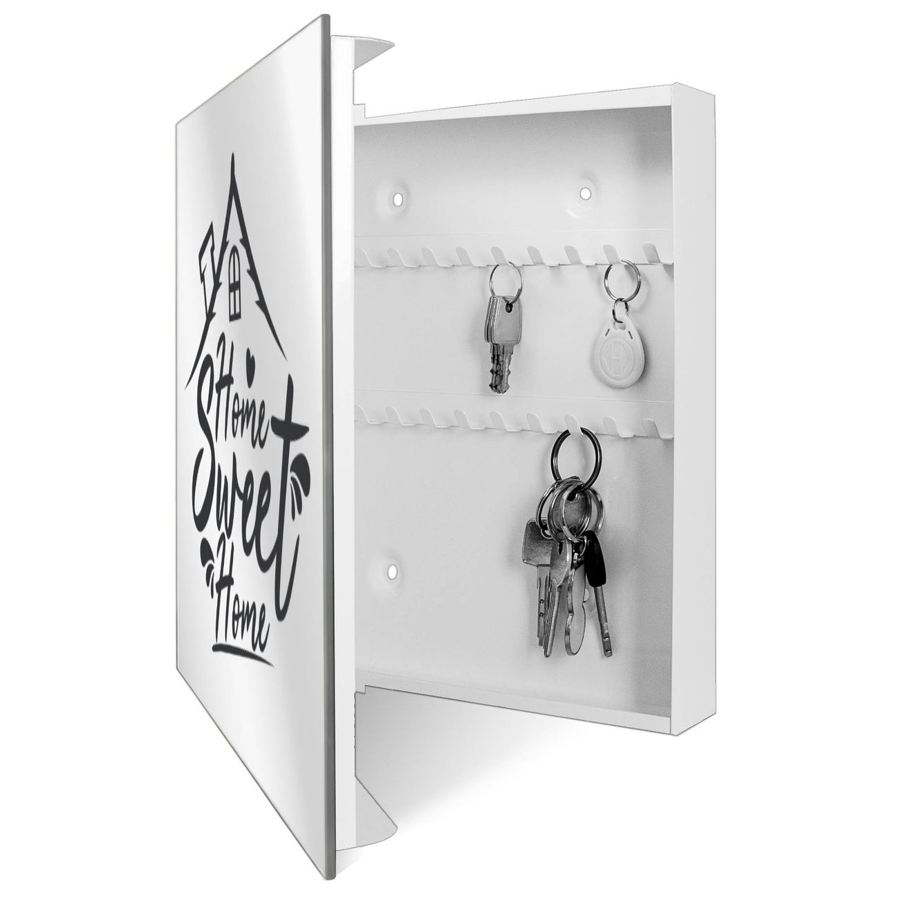 Bringe Ordnung und Stil in deinen Eingangsbereich mit dem banjado Schlüsselkasten mit Spiegel. Die elegante Spiegelfront kombiniert Funktionalität mit modernem Design und macht die Schlüsselaufbewahrung zu einem dekorativen Highlight. ✅ Spiegel Schlüsselaufbewahrung mit Motiv Motiv Home sweet Home 4 Der Design-Schlüsselkasten Motiv Motiv Home sweet Home 4 bietet Platz für bis zu 50 Schlüssel, die auf 5 stabilen Reihen mit je 10 Haken übersichtlich verstaut werden. Mit seinen kompakten Maßen von 30 x 30 x 5 cm passt die Schlüsselbox perfekt auch in kleinere Räume. Der weiß lackierte Stahlkorpus mit rechts angeschlagenem Türscharnier harmoniert mit der Spiegelfront und fügt sich nahtlos in jedes Wohnambiente ein. Ob als Schlüsselorganizer für Zuhause oder als praktische Lösung für Büros, Praxen und Gewerbe, der banjado Schlüsselkasten sorgt für Ordnung und Übersicht. Die Spiegelfront verleiht dem Eingangsbereich zusätzliche Funktionalität und lässt Räume optisch größer wirken. Die Schlüsselbox Motiv Motiv Home sweet Home 4 zur Wandmontage wird inklusive Befestigungsmaterial geliefert und ist schnell angebracht. So hast du deine Schlüssel jederzeit griffbereit und zugleich stilvoll verstaut. Mit diesem banjado Schlüsselkasten Motiv Motiv Home sweet Home 4 kombinierst du praktische Aufbewahrung mit stilvollem Wohndesign. Ob privat oder geschäftlich, die Schlüsselbox sorgt für mehr Ordnung, Übersicht und ein wohnliches Ambiente.Vorteile im Überblick