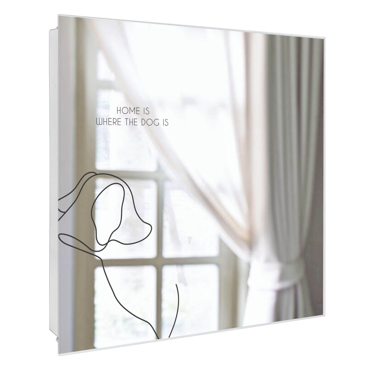 Bringe Ordnung und Stil in deinen Eingangsbereich mit dem banjado Schlüsselkasten mit Spiegel. Die elegante Spiegelfront kombiniert Funktionalität mit modernem Design und macht die Schlüsselaufbewahrung zu einem dekorativen Highlight. ✅ Spiegel Schlüsselaufbewahrung mit Motiv Motiv Hundeheimat Der Design-Schlüsselkasten Motiv Motiv Hundeheimat bietet Platz für bis zu 50 Schlüssel, die auf 5 stabilen Reihen mit je 10 Haken übersichtlich verstaut werden. Mit seinen kompakten Maßen von 30 x 30 x 5 cm passt die Schlüsselbox perfekt auch in kleinere Räume. Der weiß lackierte Stahlkorpus mit rechts angeschlagenem Türscharnier harmoniert mit der Spiegelfront und fügt sich nahtlos in jedes Wohnambiente ein. Ob als Schlüsselorganizer für Zuhause oder als praktische Lösung für Büros, Praxen und Gewerbe, der banjado Schlüsselkasten sorgt für Ordnung und Übersicht. Die Spiegelfront verleiht dem Eingangsbereich zusätzliche Funktionalität und lässt Räume optisch größer wirken. Die Schlüsselbox Motiv Motiv Hundeheimat zur Wandmontage wird inklusive Befestigungsmaterial geliefert und ist schnell angebracht. So hast du deine Schlüssel jederzeit griffbereit und zugleich stilvoll verstaut. Mit diesem banjado Schlüsselkasten Motiv Motiv Hundeheimat kombinierst du praktische Aufbewahrung mit stilvollem Wohndesign. Ob privat oder geschäftlich, die Schlüsselbox sorgt für mehr Ordnung, Übersicht und ein wohnliches Ambiente.Vorteile im Überblick