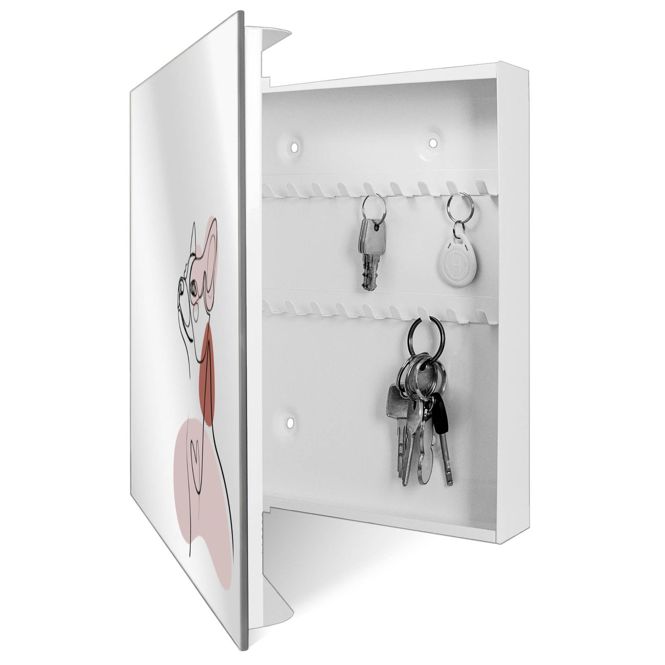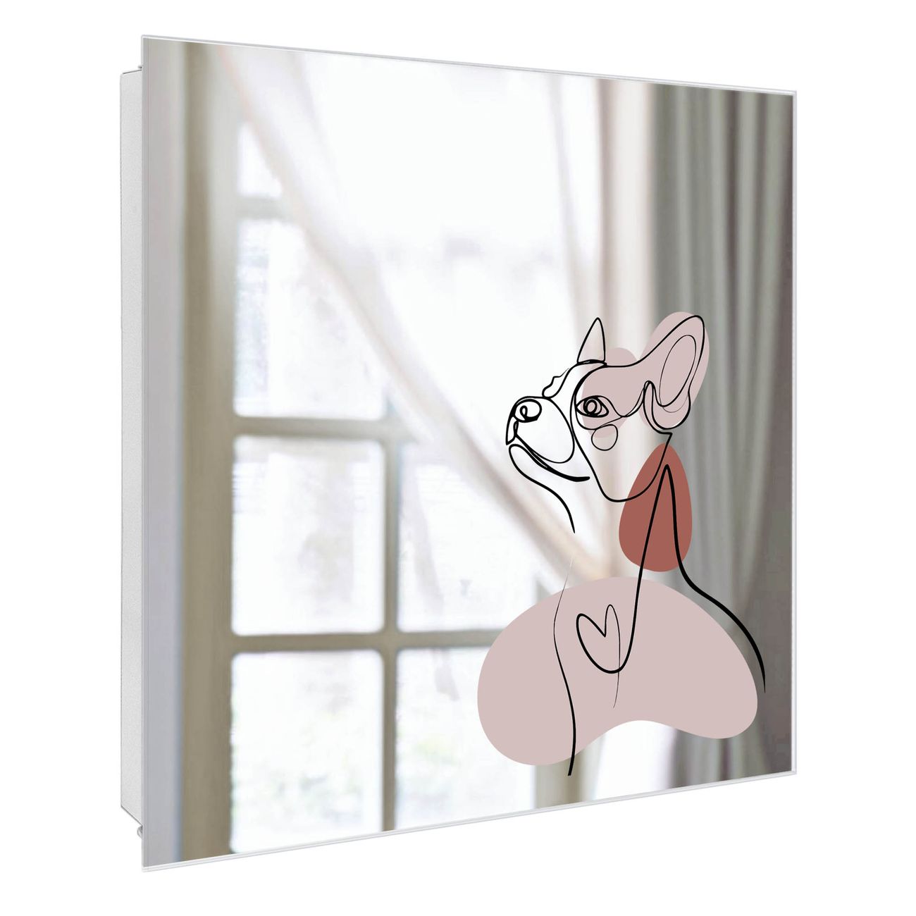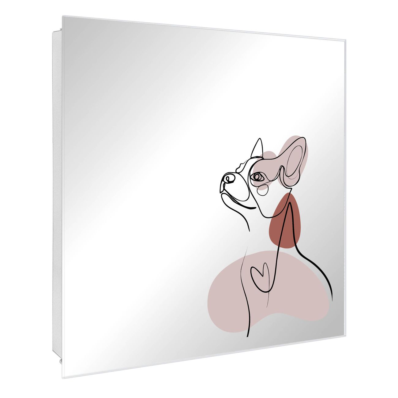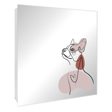 Bringe Ordnung und Stil in deinen Eingangsbereich mit dem banjado Schlüsselkasten mit Spiegel. Die elegante Spiegelfront kombiniert Funktionalität mit modernem Design und macht die Schlüsselaufbewahrung zu einem dekorativen Highlight. ✅ Spiegel Schlüsselaufbewahrung mit Motiv Motiv Hundeporträt Der Design-Schlüsselkasten Motiv Motiv Hundeporträt bietet Platz für bis zu 50 Schlüssel, die auf 5 stabilen Reihen mit je 10 Haken übersichtlich verstaut werden. Mit seinen kompakten Maßen von 30 x 30 x 5 cm passt die Schlüsselbox perfekt auch in kleinere Räume. Der weiß lackierte Stahlkorpus mit rechts angeschlagenem Türscharnier harmoniert mit der Spiegelfront und fügt sich nahtlos in jedes Wohnambiente ein. Ob als Schlüsselorganizer für Zuhause oder als praktische Lösung für Büros, Praxen und Gewerbe, der banjado Schlüsselkasten sorgt für Ordnung und Übersicht. Die Spiegelfront verleiht dem Eingangsbereich zusätzliche Funktionalität und lässt Räume optisch größer wirken. Die Schlüsselbox Motiv Motiv Hundeporträt zur Wandmontage wird inklusive Befestigungsmaterial geliefert und ist schnell angebracht. So hast du deine Schlüssel jederzeit griffbereit und zugleich stilvoll verstaut. Mit diesem banjado Schlüsselkasten Motiv Motiv Hundeporträt kombinierst du praktische Aufbewahrung mit stilvollem Wohndesign. Ob privat oder geschäftlich, die Schlüsselbox sorgt für mehr Ordnung, Übersicht und ein wohnliches Ambiente.Vorteile im Überblick