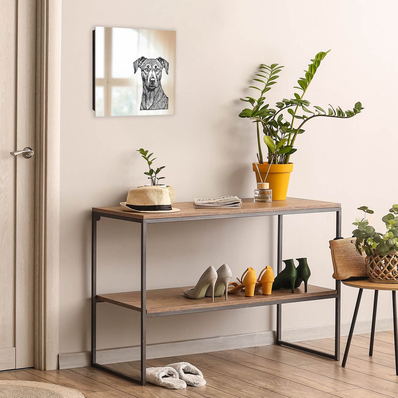 Bringe Ordnung und Stil in deinen Eingangsbereich mit dem banjado Schlüsselkasten mit Spiegel. Die elegante Spiegelfront kombiniert Funktionalität mit modernem Design und macht die Schlüsselaufbewahrung zu einem dekorativen Highlight. ✅ Spiegel Schlüsselaufbewahrung mit Motiv Motiv Hundeskizze Der Design-Schlüsselkasten Motiv Motiv Hundeskizze bietet Platz für bis zu 50 Schlüssel, die auf 5 stabilen Reihen mit je 10 Haken übersichtlich verstaut werden. Mit seinen kompakten Maßen von 30 x 30 x 5 cm passt die Schlüsselbox perfekt auch in kleinere Räume. Der schwarz lackierte Stahlkorpus mit rechts angeschlagenem Türscharnier harmoniert mit der Spiegelfront und fügt sich nahtlos in jedes Wohnambiente ein. Ob als Schlüsselorganizer für Zuhause oder als praktische Lösung für Büros, Praxen und Gewerbe, der banjado Schlüsselkasten sorgt für Ordnung und Übersicht. Die Spiegelfront verleiht dem Eingangsbereich zusätzliche Funktionalität und lässt Räume optisch größer wirken. Die Schlüsselbox Motiv Motiv Hundeskizze zur Wandmontage wird inklusive Befestigungsmaterial geliefert und ist schnell angebracht. So hast du deine Schlüssel jederzeit griffbereit und zugleich stilvoll verstaut. Mit diesem banjado Schlüsselkasten Motiv Motiv Hundeskizze kombinierst du praktische Aufbewahrung mit stilvollem Wohndesign. Ob privat oder geschäftlich, die Schlüsselbox sorgt für mehr Ordnung, Übersicht und ein wohnliches Ambiente.Vorteile im Überblick