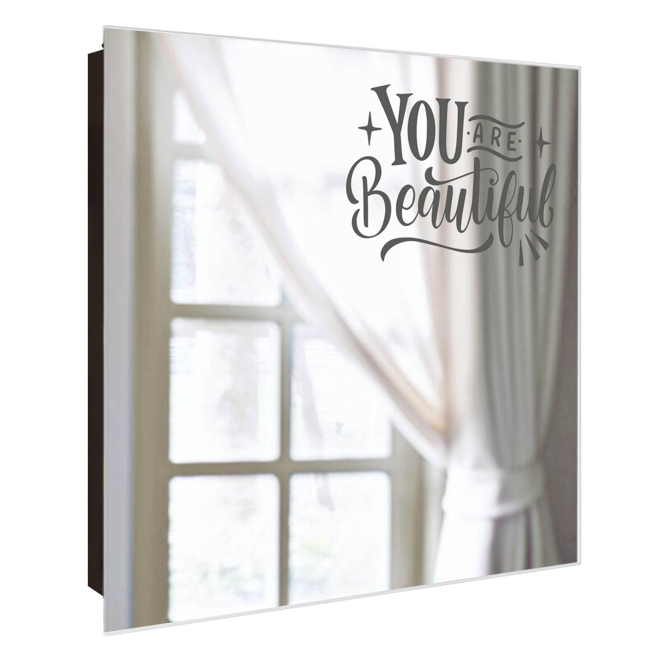 Bringe Ordnung und Stil in deinen Eingangsbereich mit dem banjado Schlüsselkasten mit Spiegel. Die elegante Spiegelfront kombiniert Funktionalität mit modernem Design und macht die Schlüsselaufbewahrung zu einem dekorativen Highlight. ✅ Spiegel Schlüsselaufbewahrung mit Motiv Motiv Inspirierende Botschaft Der Design-Schlüsselkasten Motiv Motiv Inspirierende Botschaft bietet Platz für bis zu 50 Schlüssel, die auf 5 stabilen Reihen mit je 10 Haken übersichtlich verstaut werden. Mit seinen kompakten Maßen von 30 x 30 x 5 cm passt die Schlüsselbox perfekt auch in kleinere Räume. Der schwarz lackierte Stahlkorpus mit rechts angeschlagenem Türscharnier harmoniert mit der Spiegelfront und fügt sich nahtlos in jedes Wohnambiente ein. Ob als Schlüsselorganizer für Zuhause oder als praktische Lösung für Büros, Praxen und Gewerbe, der banjado Schlüsselkasten sorgt für Ordnung und Übersicht. Die Spiegelfront verleiht dem Eingangsbereich zusätzliche Funktionalität und lässt Räume optisch größer wirken. Die Schlüsselbox Motiv Motiv Inspirierende Botschaft zur Wandmontage wird inklusive Befestigungsmaterial geliefert und ist schnell angebracht. So hast du deine Schlüssel jederzeit griffbereit und zugleich stilvoll verstaut. Mit diesem banjado Schlüsselkasten Motiv Motiv Inspirierende Botschaft kombinierst du praktische Aufbewahrung mit stilvollem Wohndesign. Ob privat oder geschäftlich, die Schlüsselbox sorgt für mehr Ordnung, Übersicht und ein wohnliches Ambiente.Vorteile im Überblick