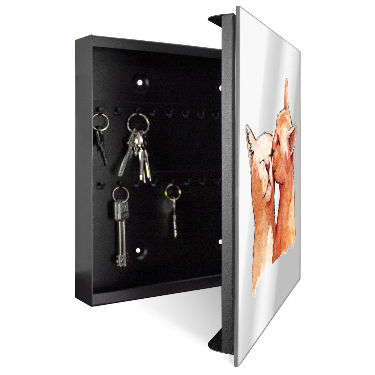 Bringe Ordnung und Stil in deinen Eingangsbereich mit dem banjado Schlüsselkasten mit Spiegel. Die elegante Spiegelfront kombiniert Funktionalität mit modernem Design und macht die Schlüsselaufbewahrung zu einem dekorativen Highlight. ✅ Spiegel Schlüsselaufbewahrung mit Motiv Motiv Katzenkuss Der Design-Schlüsselkasten Motiv Motiv Katzenkuss bietet Platz für bis zu 50 Schlüssel, die auf 5 stabilen Reihen mit je 10 Haken übersichtlich verstaut werden. Mit seinen kompakten Maßen von 30 x 30 x 5 cm passt die Schlüsselbox perfekt auch in kleinere Räume. Der schwarz lackierte Stahlkorpus mit rechts angeschlagenem Türscharnier harmoniert mit der Spiegelfront und fügt sich nahtlos in jedes Wohnambiente ein. Ob als Schlüsselorganizer für Zuhause oder als praktische Lösung für Büros, Praxen und Gewerbe, der banjado Schlüsselkasten sorgt für Ordnung und Übersicht. Die Spiegelfront verleiht dem Eingangsbereich zusätzliche Funktionalität und lässt Räume optisch größer wirken. Die Schlüsselbox Motiv Motiv Katzenkuss zur Wandmontage wird inklusive Befestigungsmaterial geliefert und ist schnell angebracht. So hast du deine Schlüssel jederzeit griffbereit und zugleich stilvoll verstaut. Mit diesem banjado Schlüsselkasten Motiv Motiv Katzenkuss kombinierst du praktische Aufbewahrung mit stilvollem Wohndesign. Ob privat oder geschäftlich, die Schlüsselbox sorgt für mehr Ordnung, Übersicht und ein wohnliches Ambiente.Vorteile im Überblick