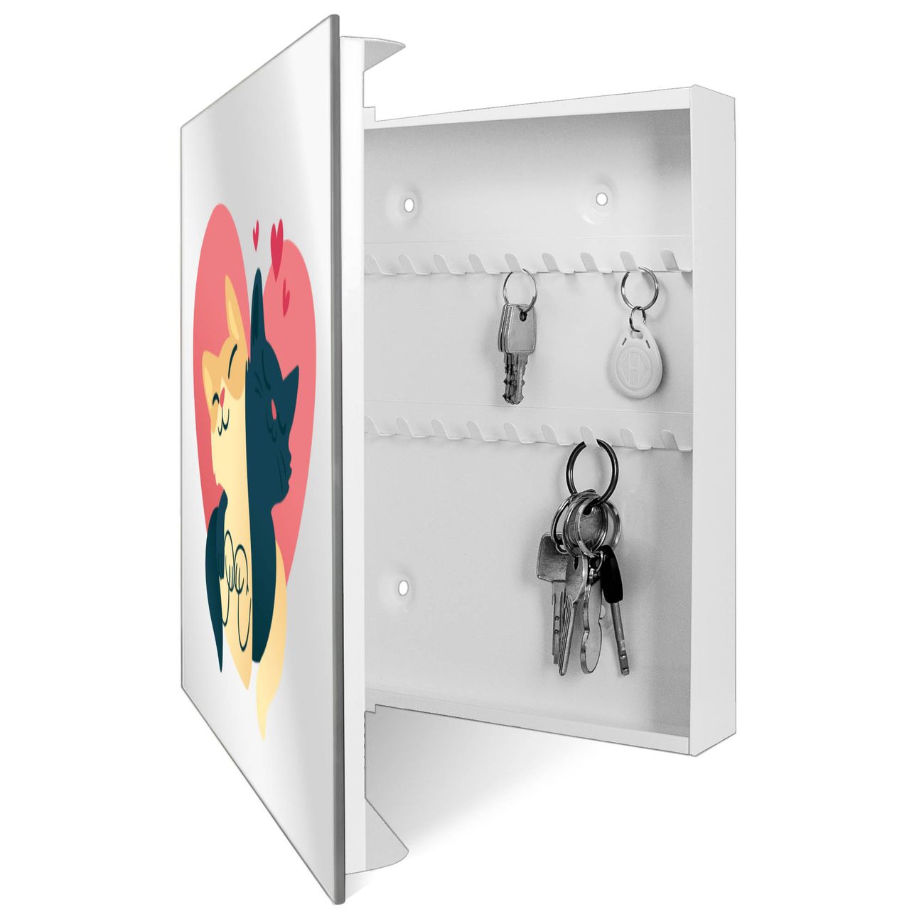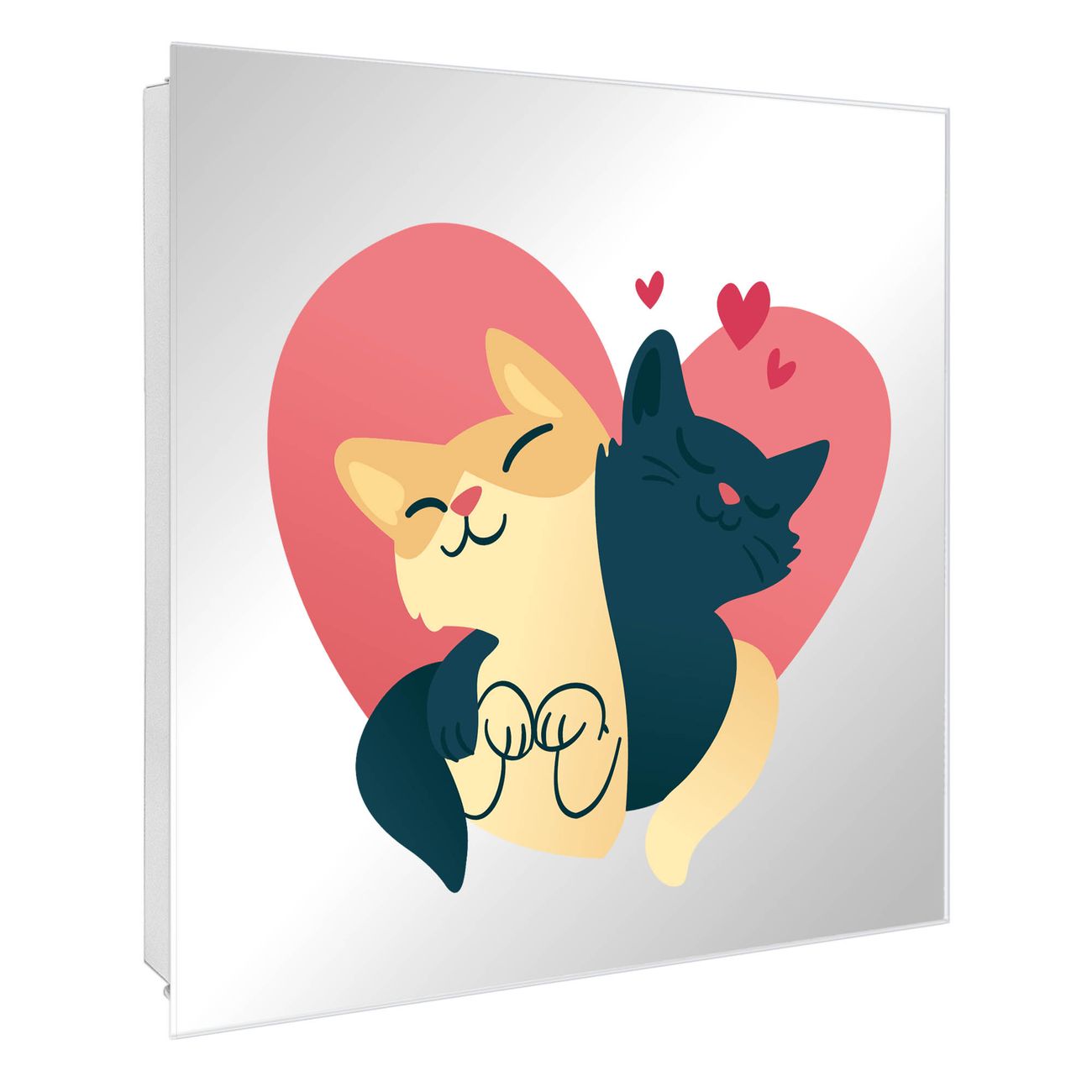 Bringe Ordnung und Stil in deinen Eingangsbereich mit dem banjado Schlüsselkasten mit Spiegel. Die elegante Spiegelfront kombiniert Funktionalität mit modernem Design und macht die Schlüsselaufbewahrung zu einem dekorativen Highlight. ✅ Spiegel Schlüsselaufbewahrung mit Motiv Motiv Katzenliebe Der Design-Schlüsselkasten Motiv Motiv Katzenliebe bietet Platz für bis zu 50 Schlüssel, die auf 5 stabilen Reihen mit je 10 Haken übersichtlich verstaut werden. Mit seinen kompakten Maßen von 30 x 30 x 5 cm passt die Schlüsselbox perfekt auch in kleinere Räume. Der weiß lackierte Stahlkorpus mit rechts angeschlagenem Türscharnier harmoniert mit der Spiegelfront und fügt sich nahtlos in jedes Wohnambiente ein. Ob als Schlüsselorganizer für Zuhause oder als praktische Lösung für Büros, Praxen und Gewerbe, der banjado Schlüsselkasten sorgt für Ordnung und Übersicht. Die Spiegelfront verleiht dem Eingangsbereich zusätzliche Funktionalität und lässt Räume optisch größer wirken. Die Schlüsselbox Motiv Motiv Katzenliebe zur Wandmontage wird inklusive Befestigungsmaterial geliefert und ist schnell angebracht. So hast du deine Schlüssel jederzeit griffbereit und zugleich stilvoll verstaut. Mit diesem banjado Schlüsselkasten Motiv Motiv Katzenliebe kombinierst du praktische Aufbewahrung mit stilvollem Wohndesign. Ob privat oder geschäftlich, die Schlüsselbox sorgt für mehr Ordnung, Übersicht und ein wohnliches Ambiente.Vorteile im Überblick