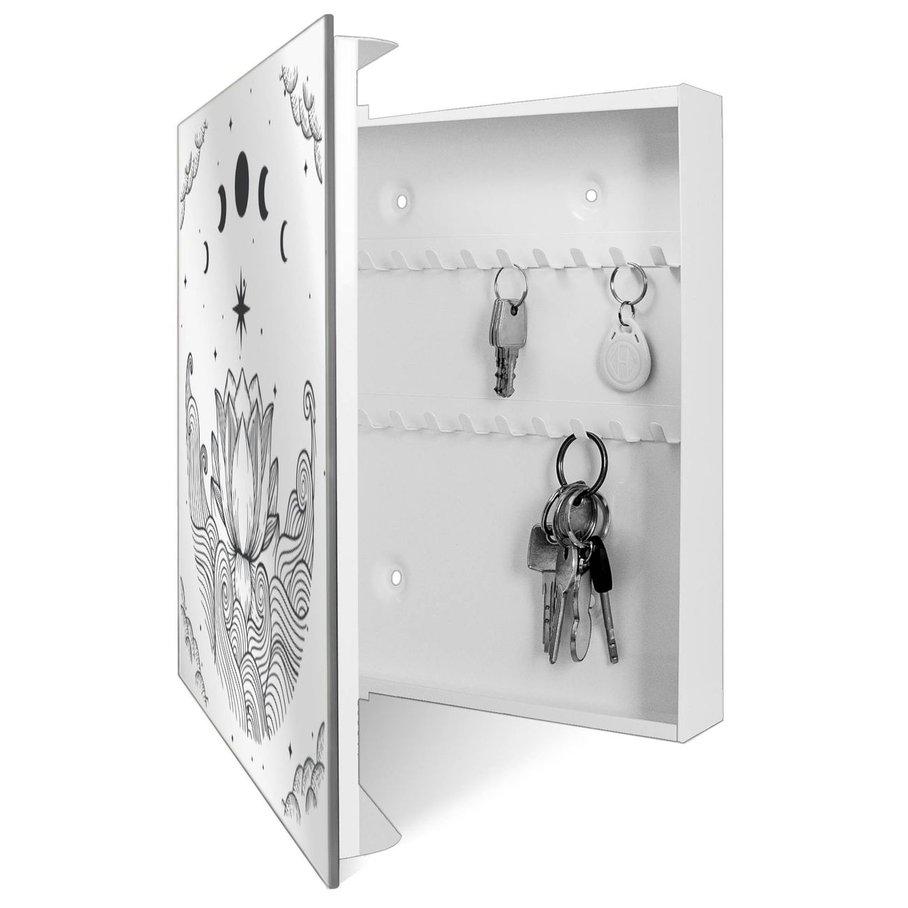 Bringe Ordnung und Stil in deinen Eingangsbereich mit dem banjado Schlüsselkasten mit Spiegel. Die elegante Spiegelfront kombiniert Funktionalität mit modernem Design und macht die Schlüsselaufbewahrung zu einem dekorativen Highlight. ✅ Spiegel Schlüsselaufbewahrung mit Motiv Motiv Lotus und Mondphasen 2 Der Design-Schlüsselkasten Motiv Motiv Lotus und Mondphasen 2 bietet Platz für bis zu 50 Schlüssel, die auf 5 stabilen Reihen mit je 10 Haken übersichtlich verstaut werden. Mit seinen kompakten Maßen von 30 x 30 x 5 cm passt die Schlüsselbox perfekt auch in kleinere Räume. Der weiß lackierte Stahlkorpus mit rechts angeschlagenem Türscharnier harmoniert mit der Spiegelfront und fügt sich nahtlos in jedes Wohnambiente ein. Ob als Schlüsselorganizer für Zuhause oder als praktische Lösung für Büros, Praxen und Gewerbe, der banjado Schlüsselkasten sorgt für Ordnung und Übersicht. Die Spiegelfront verleiht dem Eingangsbereich zusätzliche Funktionalität und lässt Räume optisch größer wirken. Die Schlüsselbox Motiv Motiv Lotus und Mondphasen 2 zur Wandmontage wird inklusive Befestigungsmaterial geliefert und ist schnell angebracht. So hast du deine Schlüssel jederzeit griffbereit und zugleich stilvoll verstaut. Mit diesem banjado Schlüsselkasten Motiv Motiv Lotus und Mondphasen 2 kombinierst du praktische Aufbewahrung mit stilvollem Wohndesign. Ob privat oder geschäftlich, die Schlüsselbox sorgt für mehr Ordnung, Übersicht und ein wohnliches Ambiente.Vorteile im Überblick