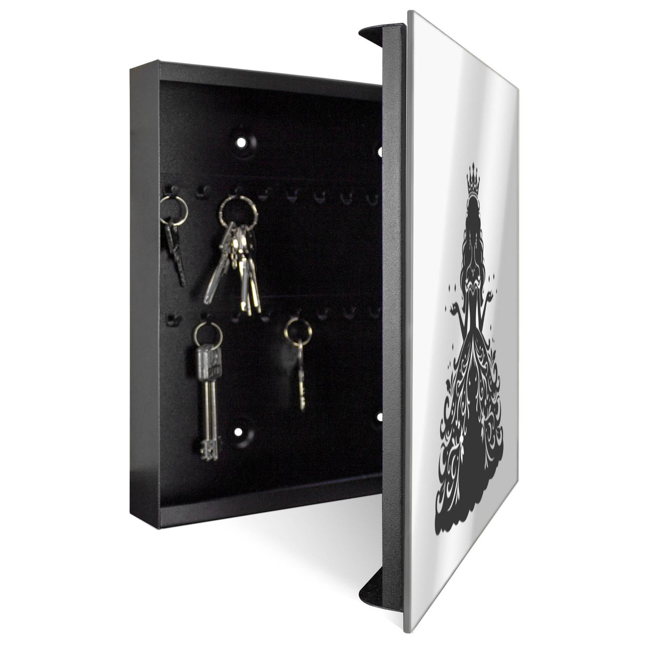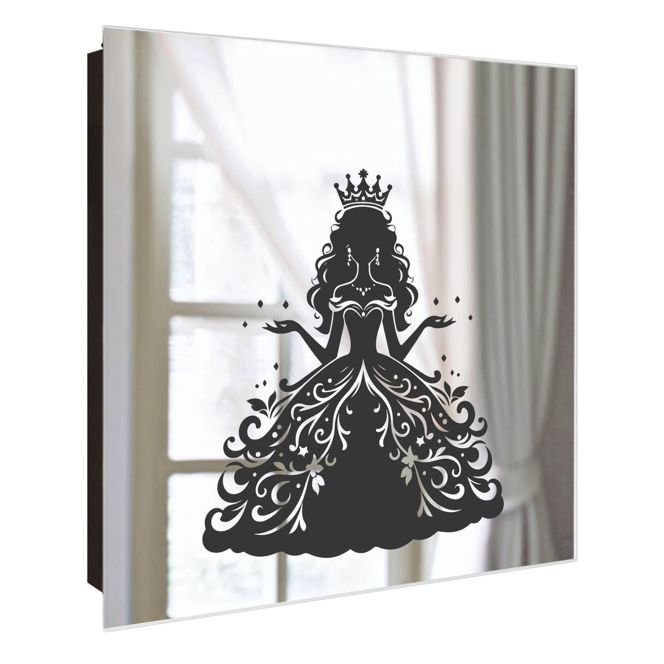Bringe Ordnung und Stil in deinen Eingangsbereich mit dem banjado Schlüsselkasten mit Spiegel. Die elegante Spiegelfront kombiniert Funktionalität mit modernem Design und macht die Schlüsselaufbewahrung zu einem dekorativen Highlight. ✅ Spiegel Schlüsselaufbewahrung mit Motiv Motiv Märchenprinzessin Der Design-Schlüsselkasten Motiv Motiv Märchenprinzessin bietet Platz für bis zu 50 Schlüssel, die auf 5 stabilen Reihen mit je 10 Haken übersichtlich verstaut werden. Mit seinen kompakten Maßen von 30 x 30 x 5 cm passt die Schlüsselbox perfekt auch in kleinere Räume. Der schwarz lackierte Stahlkorpus mit rechts angeschlagenem Türscharnier harmoniert mit der Spiegelfront und fügt sich nahtlos in jedes Wohnambiente ein. Ob als Schlüsselorganizer für Zuhause oder als praktische Lösung für Büros, Praxen und Gewerbe, der banjado Schlüsselkasten sorgt für Ordnung und Übersicht. Die Spiegelfront verleiht dem Eingangsbereich zusätzliche Funktionalität und lässt Räume optisch größer wirken. Die Schlüsselbox Motiv Motiv Märchenprinzessin zur Wandmontage wird inklusive Befestigungsmaterial geliefert und ist schnell angebracht. So hast du deine Schlüssel jederzeit griffbereit und zugleich stilvoll verstaut. Mit diesem banjado Schlüsselkasten Motiv Motiv Märchenprinzessin kombinierst du praktische Aufbewahrung mit stilvollem Wohndesign. Ob privat oder geschäftlich, die Schlüsselbox sorgt für mehr Ordnung, Übersicht und ein wohnliches Ambiente.Vorteile im Überblick