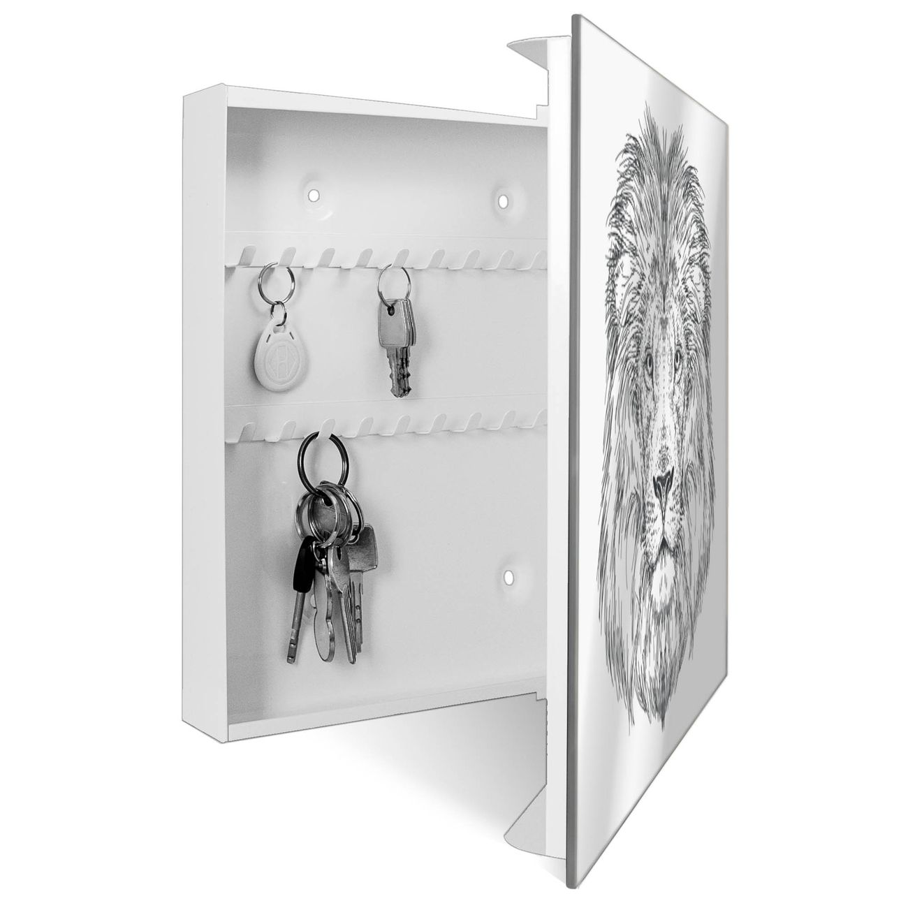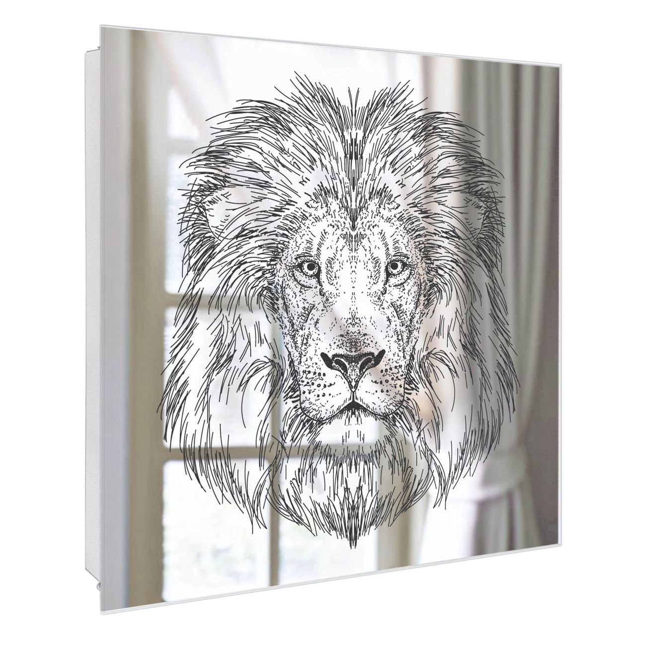 Bringe Ordnung und Stil in deinen Eingangsbereich mit dem banjado Schlüsselkasten mit Spiegel. Die elegante Spiegelfront kombiniert Funktionalität mit modernem Design und macht die Schlüsselaufbewahrung zu einem dekorativen Highlight. ✅ Spiegel Schlüsselaufbewahrung mit Motiv Motiv Majestätischer Löwe Der Design-Schlüsselkasten Motiv Motiv Majestätischer Löwe bietet Platz für bis zu 50 Schlüssel, die auf 5 stabilen Reihen mit je 10 Haken übersichtlich verstaut werden. Mit seinen kompakten Maßen von 30 x 30 x 5 cm passt die Schlüsselbox perfekt auch in kleinere Räume. Der weiß lackierte Stahlkorpus mit rechts angeschlagenem Türscharnier harmoniert mit der Spiegelfront und fügt sich nahtlos in jedes Wohnambiente ein. Ob als Schlüsselorganizer für Zuhause oder als praktische Lösung für Büros, Praxen und Gewerbe, der banjado Schlüsselkasten sorgt für Ordnung und Übersicht. Die Spiegelfront verleiht dem Eingangsbereich zusätzliche Funktionalität und lässt Räume optisch größer wirken. Die Schlüsselbox Motiv Motiv Majestätischer Löwe zur Wandmontage wird inklusive Befestigungsmaterial geliefert und ist schnell angebracht. So hast du deine Schlüssel jederzeit griffbereit und zugleich stilvoll verstaut. Mit diesem banjado Schlüsselkasten Motiv Motiv Majestätischer Löwe kombinierst du praktische Aufbewahrung mit stilvollem Wohndesign. Ob privat oder geschäftlich, die Schlüsselbox sorgt für mehr Ordnung, Übersicht und ein wohnliches Ambiente.Vorteile im Überblick