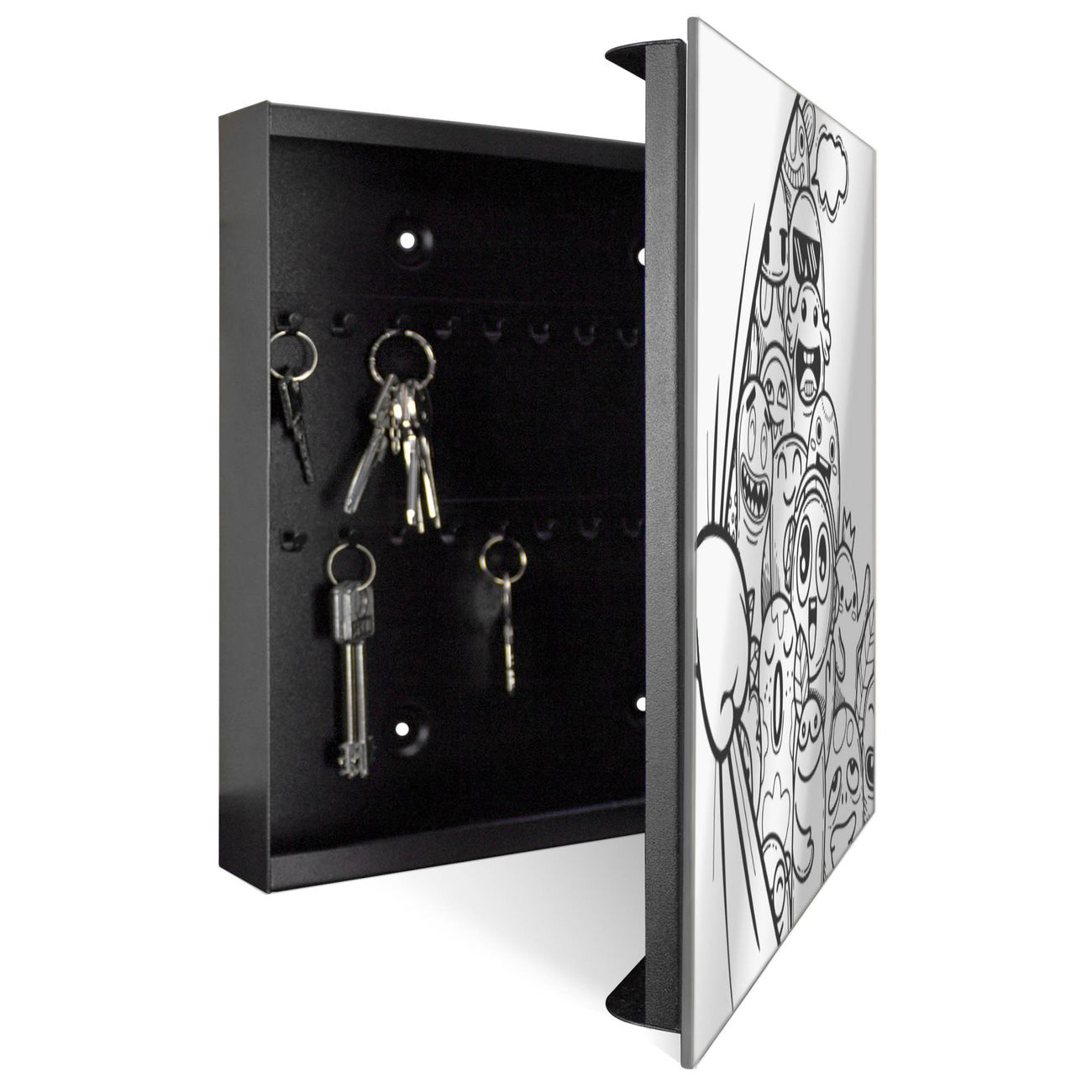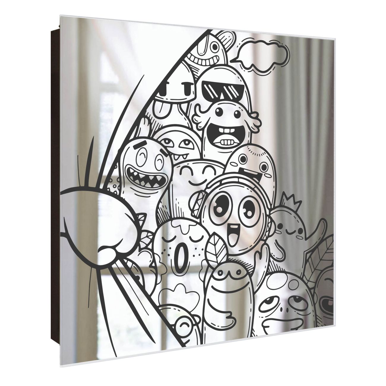 Bringe Ordnung und Stil in deinen Eingangsbereich mit dem banjado Schlüsselkasten mit Spiegel. Die elegante Spiegelfront kombiniert Funktionalität mit modernem Design und macht die Schlüsselaufbewahrung zu einem dekorativen Highlight. ✅ Spiegel Schlüsselaufbewahrung mit Motiv Motiv Monsterparty Der Design-Schlüsselkasten Motiv Motiv Monsterparty bietet Platz für bis zu 50 Schlüssel, die auf 5 stabilen Reihen mit je 10 Haken übersichtlich verstaut werden. Mit seinen kompakten Maßen von 30 x 30 x 5 cm passt die Schlüsselbox perfekt auch in kleinere Räume. Der schwarz lackierte Stahlkorpus mit rechts angeschlagenem Türscharnier harmoniert mit der Spiegelfront und fügt sich nahtlos in jedes Wohnambiente ein. Ob als Schlüsselorganizer für Zuhause oder als praktische Lösung für Büros, Praxen und Gewerbe, der banjado Schlüsselkasten sorgt für Ordnung und Übersicht. Die Spiegelfront verleiht dem Eingangsbereich zusätzliche Funktionalität und lässt Räume optisch größer wirken. Die Schlüsselbox Motiv Motiv Monsterparty zur Wandmontage wird inklusive Befestigungsmaterial geliefert und ist schnell angebracht. So hast du deine Schlüssel jederzeit griffbereit und zugleich stilvoll verstaut. Mit diesem banjado Schlüsselkasten Motiv Motiv Monsterparty kombinierst du praktische Aufbewahrung mit stilvollem Wohndesign. Ob privat oder geschäftlich, die Schlüsselbox sorgt für mehr Ordnung, Übersicht und ein wohnliches Ambiente.Vorteile im Überblick