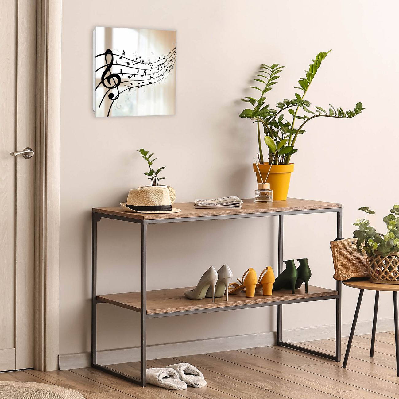 Bringe Ordnung und Stil in deinen Eingangsbereich mit dem banjado Schlüsselkasten mit Spiegel. Die elegante Spiegelfront kombiniert Funktionalität mit modernem Design und macht die Schlüsselaufbewahrung zu einem dekorativen Highlight. ✅ Spiegel Schlüsselaufbewahrung mit Motiv Motiv Musikalische Noten Der Design-Schlüsselkasten Motiv Motiv Musikalische Noten bietet Platz für bis zu 50 Schlüssel, die auf 5 stabilen Reihen mit je 10 Haken übersichtlich verstaut werden. Mit seinen kompakten Maßen von 30 x 30 x 5 cm passt die Schlüsselbox perfekt auch in kleinere Räume. Der weiß lackierte Stahlkorpus mit rechts angeschlagenem Türscharnier harmoniert mit der Spiegelfront und fügt sich nahtlos in jedes Wohnambiente ein. Ob als Schlüsselorganizer für Zuhause oder als praktische Lösung für Büros, Praxen und Gewerbe, der banjado Schlüsselkasten sorgt für Ordnung und Übersicht. Die Spiegelfront verleiht dem Eingangsbereich zusätzliche Funktionalität und lässt Räume optisch größer wirken. Die Schlüsselbox Motiv Motiv Musikalische Noten zur Wandmontage wird inklusive Befestigungsmaterial geliefert und ist schnell angebracht. So hast du deine Schlüssel jederzeit griffbereit und zugleich stilvoll verstaut. Mit diesem banjado Schlüsselkasten Motiv Motiv Musikalische Noten kombinierst du praktische Aufbewahrung mit stilvollem Wohndesign. Ob privat oder geschäftlich, die Schlüsselbox sorgt für mehr Ordnung, Übersicht und ein wohnliches Ambiente.Vorteile im Überblick