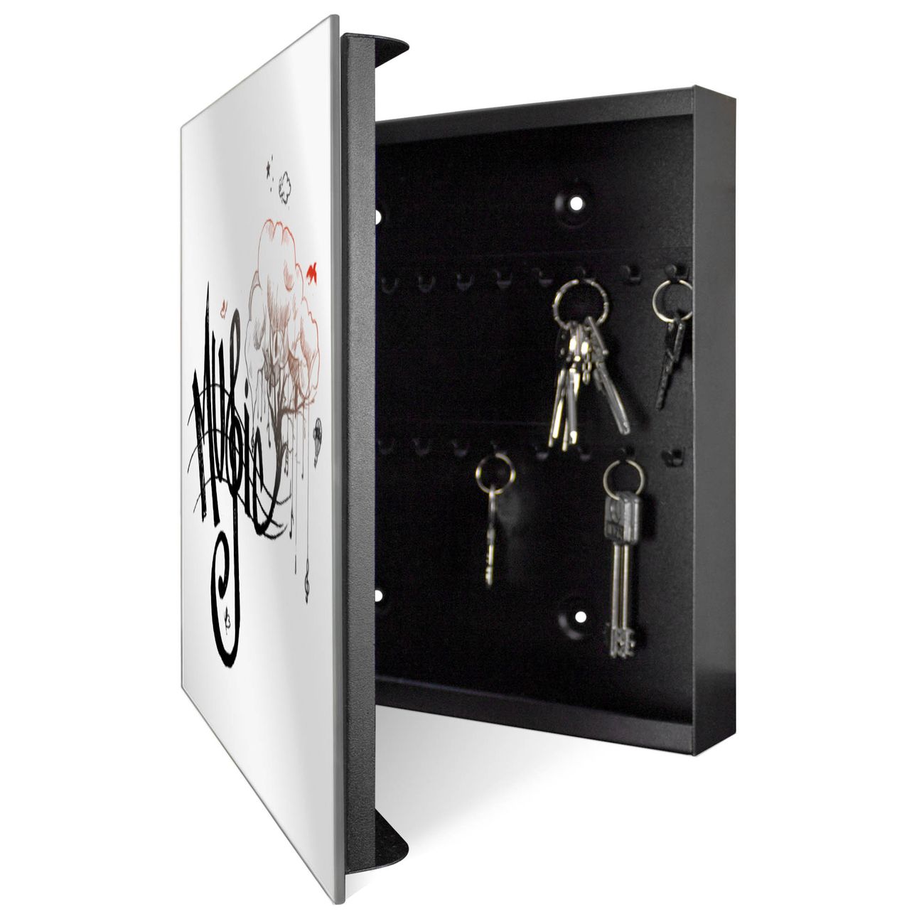 Bringe Ordnung und Stil in deinen Eingangsbereich mit dem banjado Schlüsselkasten mit Spiegel. Die elegante Spiegelfront kombiniert Funktionalität mit modernem Design und macht die Schlüsselaufbewahrung zu einem dekorativen Highlight. ✅ Spiegel Schlüsselaufbewahrung mit Motiv Motiv Musikbaum Illustration Der Design-Schlüsselkasten Motiv Motiv Musikbaum Illustration bietet Platz für bis zu 50 Schlüssel, die auf 5 stabilen Reihen mit je 10 Haken übersichtlich verstaut werden. Mit seinen kompakten Maßen von 30 x 30 x 5 cm passt die Schlüsselbox perfekt auch in kleinere Räume. Der schwarz lackierte Stahlkorpus mit rechts angeschlagenem Türscharnier harmoniert mit der Spiegelfront und fügt sich nahtlos in jedes Wohnambiente ein. Ob als Schlüsselorganizer für Zuhause oder als praktische Lösung für Büros, Praxen und Gewerbe, der banjado Schlüsselkasten sorgt für Ordnung und Übersicht. Die Spiegelfront verleiht dem Eingangsbereich zusätzliche Funktionalität und lässt Räume optisch größer wirken. Die Schlüsselbox Motiv Motiv Musikbaum Illustration zur Wandmontage wird inklusive Befestigungsmaterial geliefert und ist schnell angebracht. So hast du deine Schlüssel jederzeit griffbereit und zugleich stilvoll verstaut. Mit diesem banjado Schlüsselkasten Motiv Motiv Musikbaum Illustration kombinierst du praktische Aufbewahrung mit stilvollem Wohndesign. Ob privat oder geschäftlich, die Schlüsselbox sorgt für mehr Ordnung, Übersicht und ein wohnliches Ambiente.Vorteile im Überblick