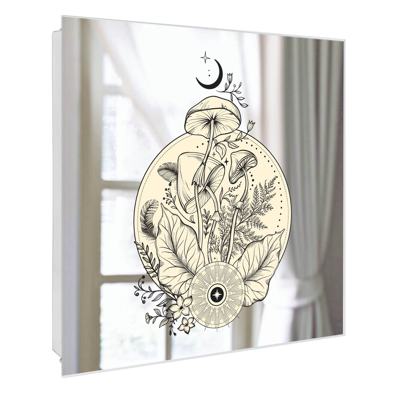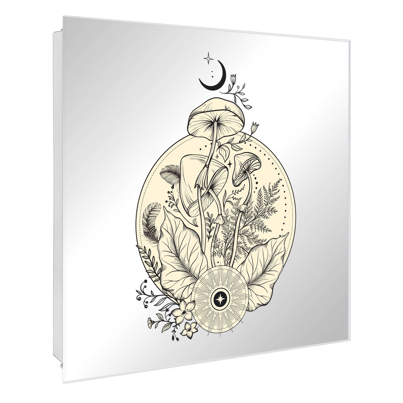 Bringe Ordnung und Stil in deinen Eingangsbereich mit dem banjado Schlüsselkasten mit Spiegel. Die elegante Spiegelfront kombiniert Funktionalität mit modernem Design und macht die Schlüsselaufbewahrung zu einem dekorativen Highlight. ✅ Spiegel Schlüsselaufbewahrung mit Motiv Motiv Mystische Natur Der Design-Schlüsselkasten Motiv Motiv Mystische Natur bietet Platz für bis zu 50 Schlüssel, die auf 5 stabilen Reihen mit je 10 Haken übersichtlich verstaut werden. Mit seinen kompakten Maßen von 30 x 30 x 5 cm passt die Schlüsselbox perfekt auch in kleinere Räume. Der weiß lackierte Stahlkorpus mit rechts angeschlagenem Türscharnier harmoniert mit der Spiegelfront und fügt sich nahtlos in jedes Wohnambiente ein. Ob als Schlüsselorganizer für Zuhause oder als praktische Lösung für Büros, Praxen und Gewerbe, der banjado Schlüsselkasten sorgt für Ordnung und Übersicht. Die Spiegelfront verleiht dem Eingangsbereich zusätzliche Funktionalität und lässt Räume optisch größer wirken. Die Schlüsselbox Motiv Motiv Mystische Natur zur Wandmontage wird inklusive Befestigungsmaterial geliefert und ist schnell angebracht. So hast du deine Schlüssel jederzeit griffbereit und zugleich stilvoll verstaut. Mit diesem banjado Schlüsselkasten Motiv Motiv Mystische Natur kombinierst du praktische Aufbewahrung mit stilvollem Wohndesign. Ob privat oder geschäftlich, die Schlüsselbox sorgt für mehr Ordnung, Übersicht und ein wohnliches Ambiente.Vorteile im Überblick