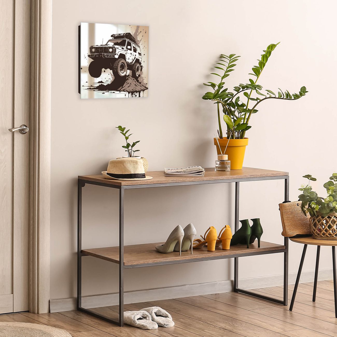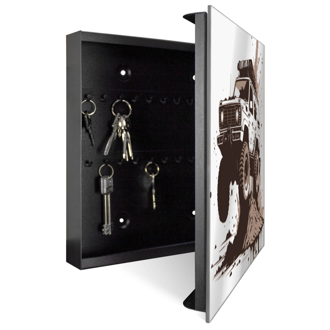 Bringe Ordnung und Stil in deinen Eingangsbereich mit dem banjado Schlüsselkasten mit Spiegel. Die elegante Spiegelfront kombiniert Funktionalität mit modernem Design und macht die Schlüsselaufbewahrung zu einem dekorativen Highlight. ✅ Spiegel Schlüsselaufbewahrung mit Motiv Motiv Offroad Abenteuer 3 Der Design-Schlüsselkasten Motiv Motiv Offroad Abenteuer 3 bietet Platz für bis zu 50 Schlüssel, die auf 5 stabilen Reihen mit je 10 Haken übersichtlich verstaut werden. Mit seinen kompakten Maßen von 30 x 30 x 5 cm passt die Schlüsselbox perfekt auch in kleinere Räume. Der schwarz lackierte Stahlkorpus mit rechts angeschlagenem Türscharnier harmoniert mit der Spiegelfront und fügt sich nahtlos in jedes Wohnambiente ein. Ob als Schlüsselorganizer für Zuhause oder als praktische Lösung für Büros, Praxen und Gewerbe, der banjado Schlüsselkasten sorgt für Ordnung und Übersicht. Die Spiegelfront verleiht dem Eingangsbereich zusätzliche Funktionalität und lässt Räume optisch größer wirken. Die Schlüsselbox Motiv Motiv Offroad Abenteuer 3 zur Wandmontage wird inklusive Befestigungsmaterial geliefert und ist schnell angebracht. So hast du deine Schlüssel jederzeit griffbereit und zugleich stilvoll verstaut. Mit diesem banjado Schlüsselkasten Motiv Motiv Offroad Abenteuer 3 kombinierst du praktische Aufbewahrung mit stilvollem Wohndesign. Ob privat oder geschäftlich, die Schlüsselbox sorgt für mehr Ordnung, Übersicht und ein wohnliches Ambiente.Vorteile im Überblick