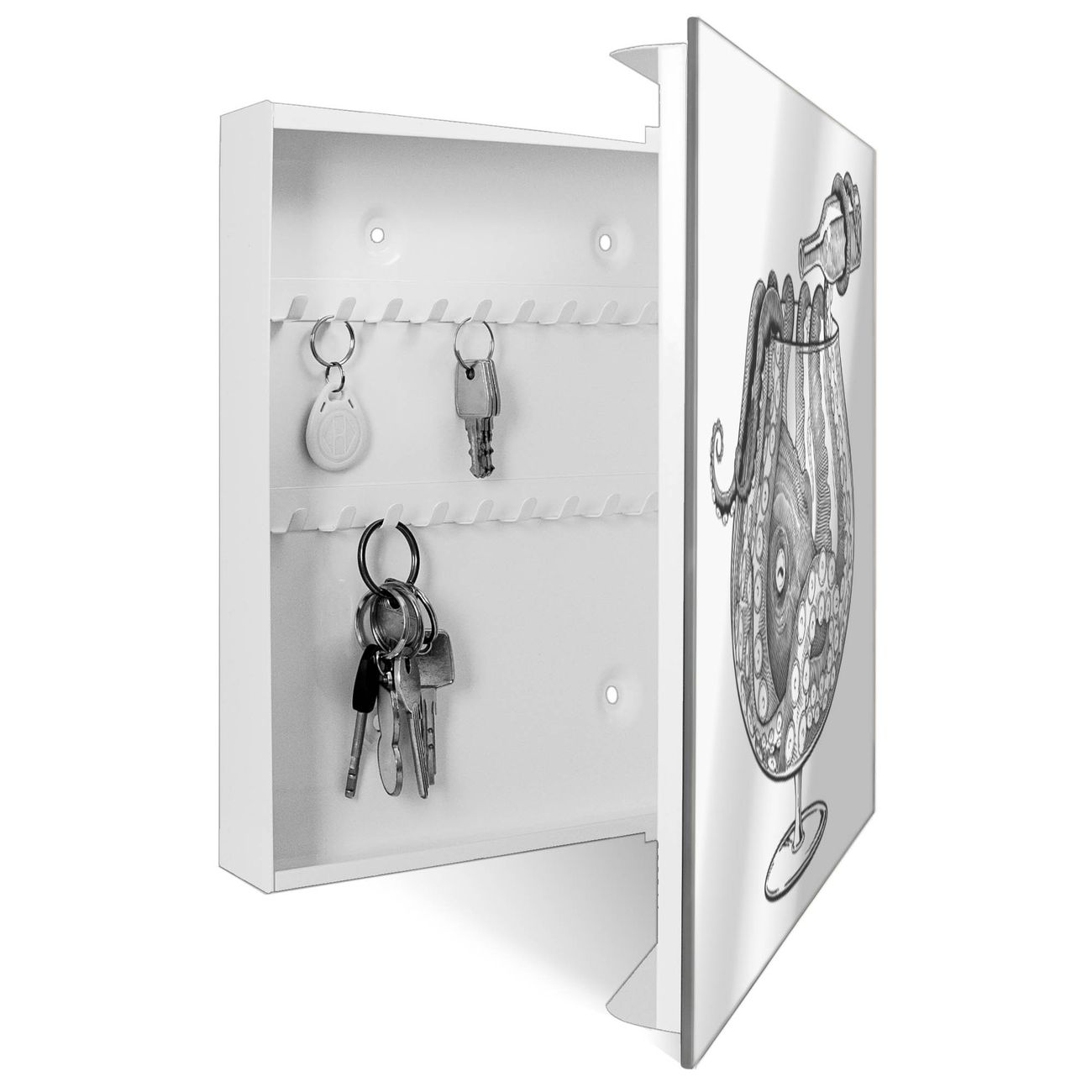 Bringe Ordnung und Stil in deinen Eingangsbereich mit dem banjado Schlüsselkasten mit Spiegel. Die elegante Spiegelfront kombiniert Funktionalität mit modernem Design und macht die Schlüsselaufbewahrung zu einem dekorativen Highlight. ✅ Spiegel Schlüsselaufbewahrung mit Motiv Motiv Oktopus im Glas 2 Der Design-Schlüsselkasten Motiv Motiv Oktopus im Glas 2 bietet Platz für bis zu 50 Schlüssel, die auf 5 stabilen Reihen mit je 10 Haken übersichtlich verstaut werden. Mit seinen kompakten Maßen von 30 x 30 x 5 cm passt die Schlüsselbox perfekt auch in kleinere Räume. Der weiß lackierte Stahlkorpus mit rechts angeschlagenem Türscharnier harmoniert mit der Spiegelfront und fügt sich nahtlos in jedes Wohnambiente ein. Ob als Schlüsselorganizer für Zuhause oder als praktische Lösung für Büros, Praxen und Gewerbe, der banjado Schlüsselkasten sorgt für Ordnung und Übersicht. Die Spiegelfront verleiht dem Eingangsbereich zusätzliche Funktionalität und lässt Räume optisch größer wirken. Die Schlüsselbox Motiv Motiv Oktopus im Glas 2 zur Wandmontage wird inklusive Befestigungsmaterial geliefert und ist schnell angebracht. So hast du deine Schlüssel jederzeit griffbereit und zugleich stilvoll verstaut. Mit diesem banjado Schlüsselkasten Motiv Motiv Oktopus im Glas 2 kombinierst du praktische Aufbewahrung mit stilvollem Wohndesign. Ob privat oder geschäftlich, die Schlüsselbox sorgt für mehr Ordnung, Übersicht und ein wohnliches Ambiente.Vorteile im Überblick
