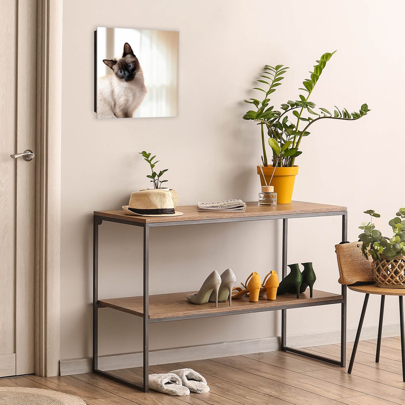 Bringe Ordnung und Stil in deinen Eingangsbereich mit dem banjado Schlüsselkasten mit Spiegel. Die elegante Spiegelfront kombiniert Funktionalität mit modernem Design und macht die Schlüsselaufbewahrung zu einem dekorativen Highlight. ✅ Spiegel Schlüsselaufbewahrung mit Motiv Motiv Porträt einer Siamkatze Der Design-Schlüsselkasten Motiv Motiv Porträt einer Siamkatze bietet Platz für bis zu 50 Schlüssel, die auf 5 stabilen Reihen mit je 10 Haken übersichtlich verstaut werden. Mit seinen kompakten Maßen von 30 x 30 x 5 cm passt die Schlüsselbox perfekt auch in kleinere Räume. Der schwarz lackierte Stahlkorpus mit rechts angeschlagenem Türscharnier harmoniert mit der Spiegelfront und fügt sich nahtlos in jedes Wohnambiente ein. Ob als Schlüsselorganizer für Zuhause oder als praktische Lösung für Büros, Praxen und Gewerbe, der banjado Schlüsselkasten sorgt für Ordnung und Übersicht. Die Spiegelfront verleiht dem Eingangsbereich zusätzliche Funktionalität und lässt Räume optisch größer wirken. Die Schlüsselbox Motiv Motiv Porträt einer Siamkatze zur Wandmontage wird inklusive Befestigungsmaterial geliefert und ist schnell angebracht. So hast du deine Schlüssel jederzeit griffbereit und zugleich stilvoll verstaut. Mit diesem banjado Schlüsselkasten Motiv Motiv Porträt einer Siamkatze kombinierst du praktische Aufbewahrung mit stilvollem Wohndesign. Ob privat oder geschäftlich, die Schlüsselbox sorgt für mehr Ordnung, Übersicht und ein wohnliches Ambiente.Vorteile im Überblick