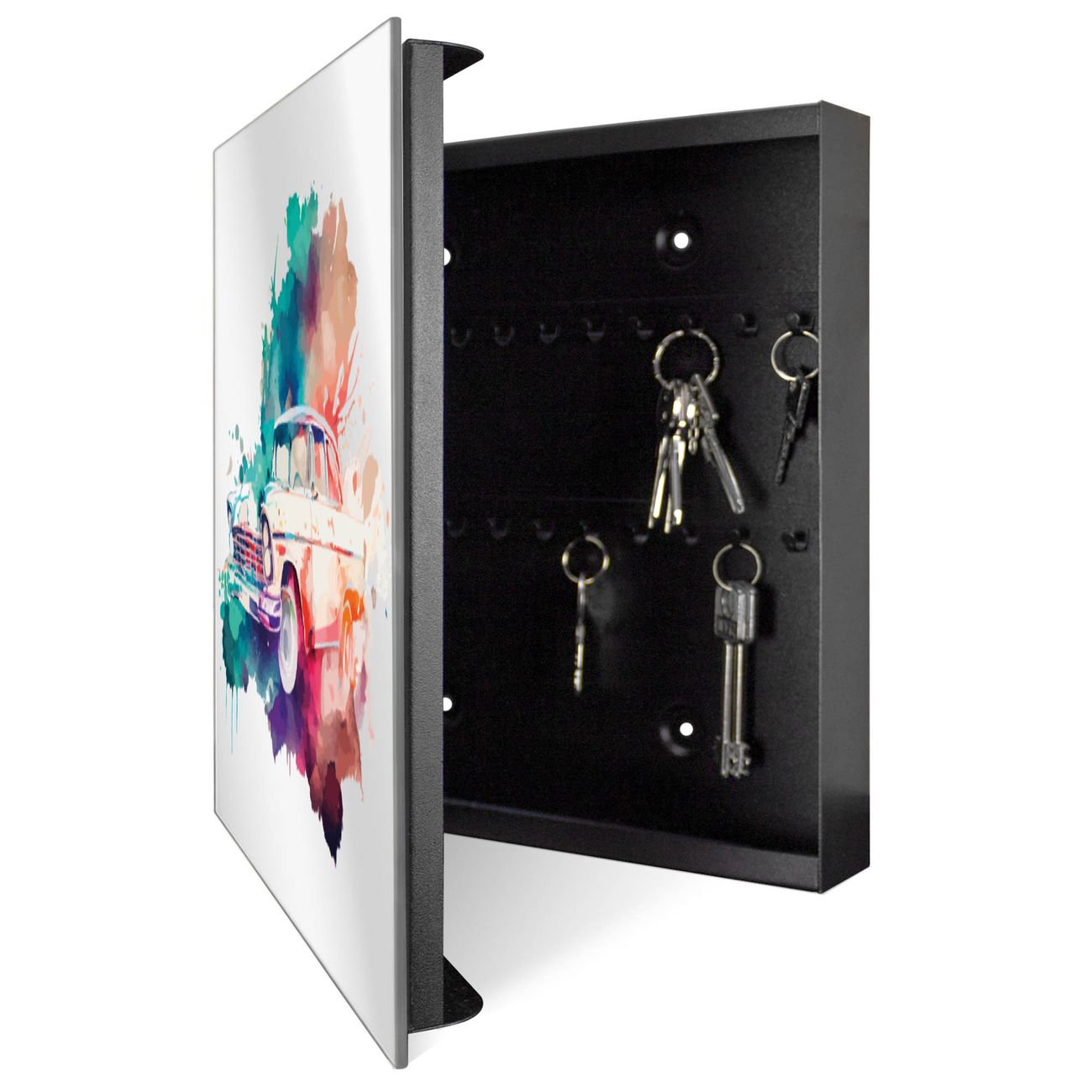 Bringe Ordnung und Stil in deinen Eingangsbereich mit dem banjado Schlüsselkasten mit Spiegel. Die elegante Spiegelfront kombiniert Funktionalität mit modernem Design und macht die Schlüsselaufbewahrung zu einem dekorativen Highlight. ✅ Spiegel Schlüsselaufbewahrung mit Motiv Motiv Retro-Auto in Aquarell Der Design-Schlüsselkasten Motiv Motiv Retro-Auto in Aquarell bietet Platz für bis zu 50 Schlüssel, die auf 5 stabilen Reihen mit je 10 Haken übersichtlich verstaut werden. Mit seinen kompakten Maßen von 30 x 30 x 5 cm passt die Schlüsselbox perfekt auch in kleinere Räume. Der schwarz lackierte Stahlkorpus mit rechts angeschlagenem Türscharnier harmoniert mit der Spiegelfront und fügt sich nahtlos in jedes Wohnambiente ein. Ob als Schlüsselorganizer für Zuhause oder als praktische Lösung für Büros, Praxen und Gewerbe, der banjado Schlüsselkasten sorgt für Ordnung und Übersicht. Die Spiegelfront verleiht dem Eingangsbereich zusätzliche Funktionalität und lässt Räume optisch größer wirken. Die Schlüsselbox Motiv Motiv Retro-Auto in Aquarell zur Wandmontage wird inklusive Befestigungsmaterial geliefert und ist schnell angebracht. So hast du deine Schlüssel jederzeit griffbereit und zugleich stilvoll verstaut. Mit diesem banjado Schlüsselkasten Motiv Motiv Retro-Auto in Aquarell kombinierst du praktische Aufbewahrung mit stilvollem Wohndesign. Ob privat oder geschäftlich, die Schlüsselbox sorgt für mehr Ordnung, Übersicht und ein wohnliches Ambiente.Vorteile im Überblick