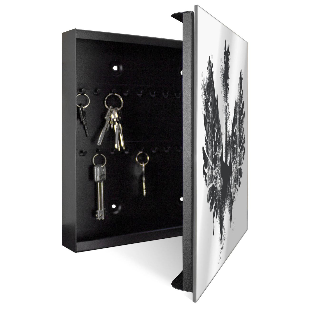 Bringe Ordnung und Stil in deinen Eingangsbereich mit dem banjado Schlüsselkasten mit Spiegel. Die elegante Spiegelfront kombiniert Funktionalität mit modernem Design und macht die Schlüsselaufbewahrung zu einem dekorativen Highlight. ✅ Spiegel Schlüsselaufbewahrung mit Motiv Motiv Rock Wings Der Design-Schlüsselkasten Motiv Motiv Rock Wings bietet Platz für bis zu 50 Schlüssel, die auf 5 stabilen Reihen mit je 10 Haken übersichtlich verstaut werden. Mit seinen kompakten Maßen von 30 x 30 x 5 cm passt die Schlüsselbox perfekt auch in kleinere Räume. Der schwarz lackierte Stahlkorpus mit rechts angeschlagenem Türscharnier harmoniert mit der Spiegelfront und fügt sich nahtlos in jedes Wohnambiente ein. Ob als Schlüsselorganizer für Zuhause oder als praktische Lösung für Büros, Praxen und Gewerbe, der banjado Schlüsselkasten sorgt für Ordnung und Übersicht. Die Spiegelfront verleiht dem Eingangsbereich zusätzliche Funktionalität und lässt Räume optisch größer wirken. Die Schlüsselbox Motiv Motiv Rock Wings zur Wandmontage wird inklusive Befestigungsmaterial geliefert und ist schnell angebracht. So hast du deine Schlüssel jederzeit griffbereit und zugleich stilvoll verstaut. Mit diesem banjado Schlüsselkasten Motiv Motiv Rock Wings kombinierst du praktische Aufbewahrung mit stilvollem Wohndesign. Ob privat oder geschäftlich, die Schlüsselbox sorgt für mehr Ordnung, Übersicht und ein wohnliches Ambiente.Vorteile im Überblick