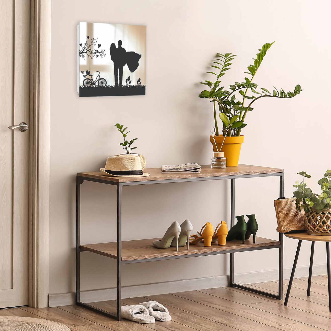 Bringe Ordnung und Stil in deinen Eingangsbereich mit dem banjado Schlüsselkasten mit Spiegel. Die elegante Spiegelfront kombiniert Funktionalität mit modernem Design und macht die Schlüsselaufbewahrung zu einem dekorativen Highlight. ✅ Spiegel Schlüsselaufbewahrung mit Motiv Motiv Romantische Silhouette Der Design-Schlüsselkasten Motiv Motiv Romantische Silhouette bietet Platz für bis zu 50 Schlüssel, die auf 5 stabilen Reihen mit je 10 Haken übersichtlich verstaut werden. Mit seinen kompakten Maßen von 30 x 30 x 5 cm passt die Schlüsselbox perfekt auch in kleinere Räume. Der weiß lackierte Stahlkorpus mit rechts angeschlagenem Türscharnier harmoniert mit der Spiegelfront und fügt sich nahtlos in jedes Wohnambiente ein. Ob als Schlüsselorganizer für Zuhause oder als praktische Lösung für Büros, Praxen und Gewerbe, der banjado Schlüsselkasten sorgt für Ordnung und Übersicht. Die Spiegelfront verleiht dem Eingangsbereich zusätzliche Funktionalität und lässt Räume optisch größer wirken. Die Schlüsselbox Motiv Motiv Romantische Silhouette zur Wandmontage wird inklusive Befestigungsmaterial geliefert und ist schnell angebracht. So hast du deine Schlüssel jederzeit griffbereit und zugleich stilvoll verstaut. Mit diesem banjado Schlüsselkasten Motiv Motiv Romantische Silhouette kombinierst du praktische Aufbewahrung mit stilvollem Wohndesign. Ob privat oder geschäftlich, die Schlüsselbox sorgt für mehr Ordnung, Übersicht und ein wohnliches Ambiente.Vorteile im Überblick