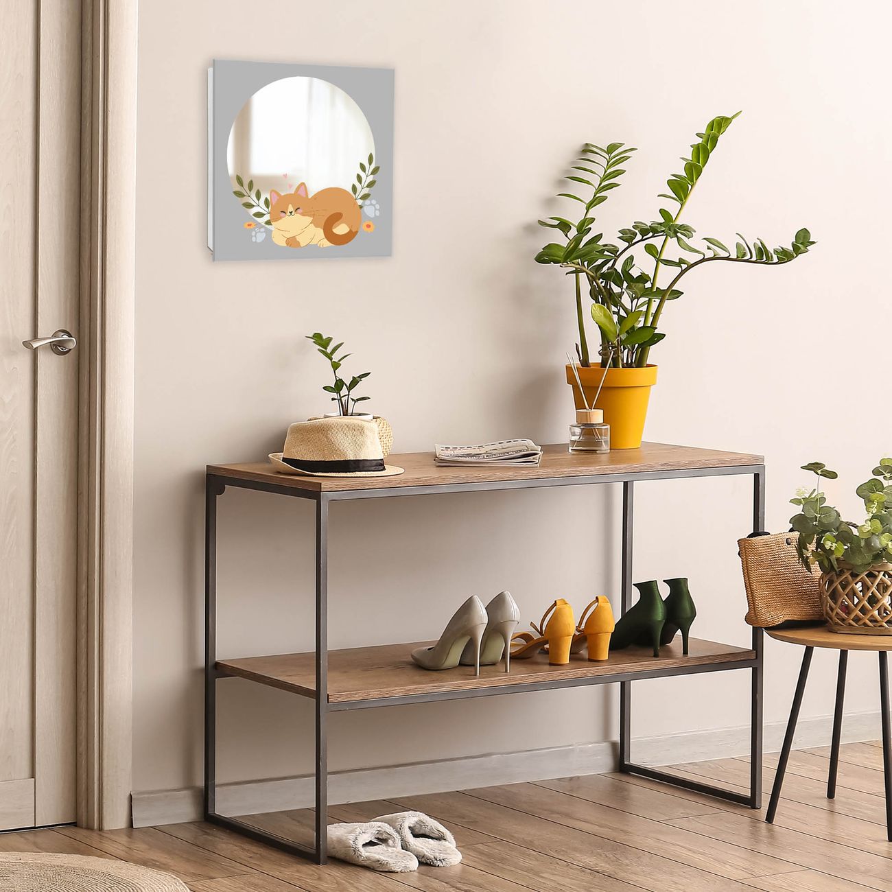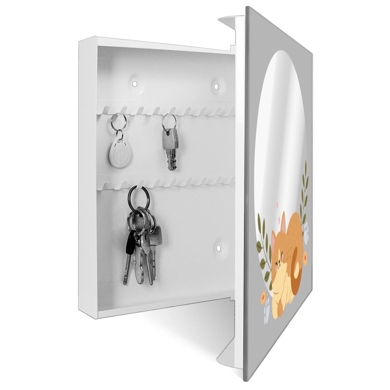 Bringe Ordnung und Stil in deinen Eingangsbereich mit dem banjado Schlüsselkasten mit Spiegel. Die elegante Spiegelfront kombiniert Funktionalität mit modernem Design und macht die Schlüsselaufbewahrung zu einem dekorativen Highlight. ✅ Spiegel Schlüsselaufbewahrung mit Motiv Motiv Schlafende Katze im Garten Der Design-Schlüsselkasten Motiv Motiv Schlafende Katze im Garten bietet Platz für bis zu 50 Schlüssel, die auf 5 stabilen Reihen mit je 10 Haken übersichtlich verstaut werden. Mit seinen kompakten Maßen von 30 x 30 x 5 cm passt die Schlüsselbox perfekt auch in kleinere Räume. Der weiß lackierte Stahlkorpus mit rechts angeschlagenem Türscharnier harmoniert mit der Spiegelfront und fügt sich nahtlos in jedes Wohnambiente ein. Ob als Schlüsselorganizer für Zuhause oder als praktische Lösung für Büros, Praxen und Gewerbe, der banjado Schlüsselkasten sorgt für Ordnung und Übersicht. Die Spiegelfront verleiht dem Eingangsbereich zusätzliche Funktionalität und lässt Räume optisch größer wirken. Die Schlüsselbox Motiv Motiv Schlafende Katze im Garten zur Wandmontage wird inklusive Befestigungsmaterial geliefert und ist schnell angebracht. So hast du deine Schlüssel jederzeit griffbereit und zugleich stilvoll verstaut. Mit diesem banjado Schlüsselkasten Motiv Motiv Schlafende Katze im Garten kombinierst du praktische Aufbewahrung mit stilvollem Wohndesign. Ob privat oder geschäftlich, die Schlüsselbox sorgt für mehr Ordnung, Übersicht und ein wohnliches Ambiente.Vorteile im Überblick