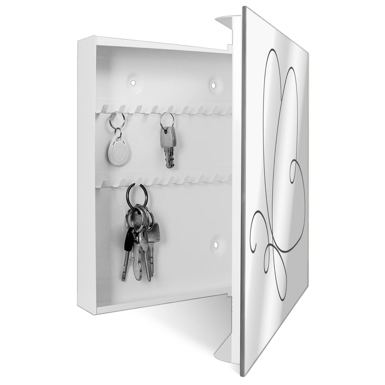 Bringe Ordnung und Stil in deinen Eingangsbereich mit dem banjado Schlüsselkasten mit Spiegel. Die elegante Spiegelfront kombiniert Funktionalität mit modernem Design und macht die Schlüsselaufbewahrung zu einem dekorativen Highlight. ✅ Spiegel Schlüsselaufbewahrung mit Motiv Motiv Schmetterling Lineart 2 Der Design-Schlüsselkasten Motiv Motiv Schmetterling Lineart 2 bietet Platz für bis zu 50 Schlüssel, die auf 5 stabilen Reihen mit je 10 Haken übersichtlich verstaut werden. Mit seinen kompakten Maßen von 30 x 30 x 5 cm passt die Schlüsselbox perfekt auch in kleinere Räume. Der weiß lackierte Stahlkorpus mit rechts angeschlagenem Türscharnier harmoniert mit der Spiegelfront und fügt sich nahtlos in jedes Wohnambiente ein. Ob als Schlüsselorganizer für Zuhause oder als praktische Lösung für Büros, Praxen und Gewerbe, der banjado Schlüsselkasten sorgt für Ordnung und Übersicht. Die Spiegelfront verleiht dem Eingangsbereich zusätzliche Funktionalität und lässt Räume optisch größer wirken. Die Schlüsselbox Motiv Motiv Schmetterling Lineart 2 zur Wandmontage wird inklusive Befestigungsmaterial geliefert und ist schnell angebracht. So hast du deine Schlüssel jederzeit griffbereit und zugleich stilvoll verstaut. Mit diesem banjado Schlüsselkasten Motiv Motiv Schmetterling Lineart 2 kombinierst du praktische Aufbewahrung mit stilvollem Wohndesign. Ob privat oder geschäftlich, die Schlüsselbox sorgt für mehr Ordnung, Übersicht und ein wohnliches Ambiente.Vorteile im Überblick