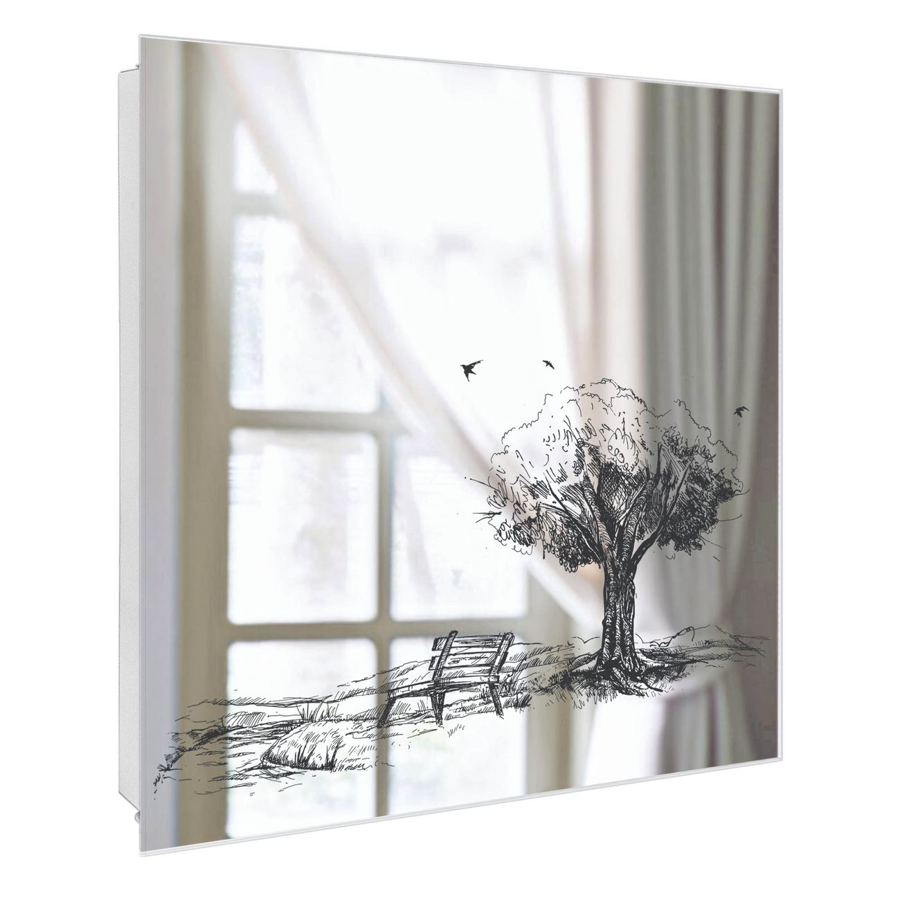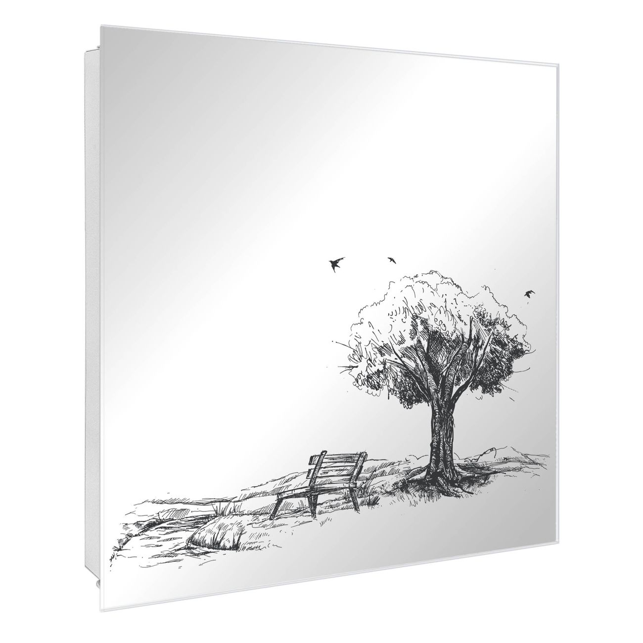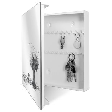 Bringe Ordnung und Stil in deinen Eingangsbereich mit dem banjado Schlüsselkasten mit Spiegel. Die elegante Spiegelfront kombiniert Funktionalität mit modernem Design und macht die Schlüsselaufbewahrung zu einem dekorativen Highlight. ✅ Spiegel Schlüsselaufbewahrung mit Motiv Motiv Sommerliche Parkszene Der Design-Schlüsselkasten Motiv Motiv Sommerliche Parkszene bietet Platz für bis zu 50 Schlüssel, die auf 5 stabilen Reihen mit je 10 Haken übersichtlich verstaut werden. Mit seinen kompakten Maßen von 30 x 30 x 5 cm passt die Schlüsselbox perfekt auch in kleinere Räume. Der weiß lackierte Stahlkorpus mit rechts angeschlagenem Türscharnier harmoniert mit der Spiegelfront und fügt sich nahtlos in jedes Wohnambiente ein. Ob als Schlüsselorganizer für Zuhause oder als praktische Lösung für Büros, Praxen und Gewerbe, der banjado Schlüsselkasten sorgt für Ordnung und Übersicht. Die Spiegelfront verleiht dem Eingangsbereich zusätzliche Funktionalität und lässt Räume optisch größer wirken. Die Schlüsselbox Motiv Motiv Sommerliche Parkszene zur Wandmontage wird inklusive Befestigungsmaterial geliefert und ist schnell angebracht. So hast du deine Schlüssel jederzeit griffbereit und zugleich stilvoll verstaut. Mit diesem banjado Schlüsselkasten Motiv Motiv Sommerliche Parkszene kombinierst du praktische Aufbewahrung mit stilvollem Wohndesign. Ob privat oder geschäftlich, die Schlüsselbox sorgt für mehr Ordnung, Übersicht und ein wohnliches Ambiente.Vorteile im Überblick