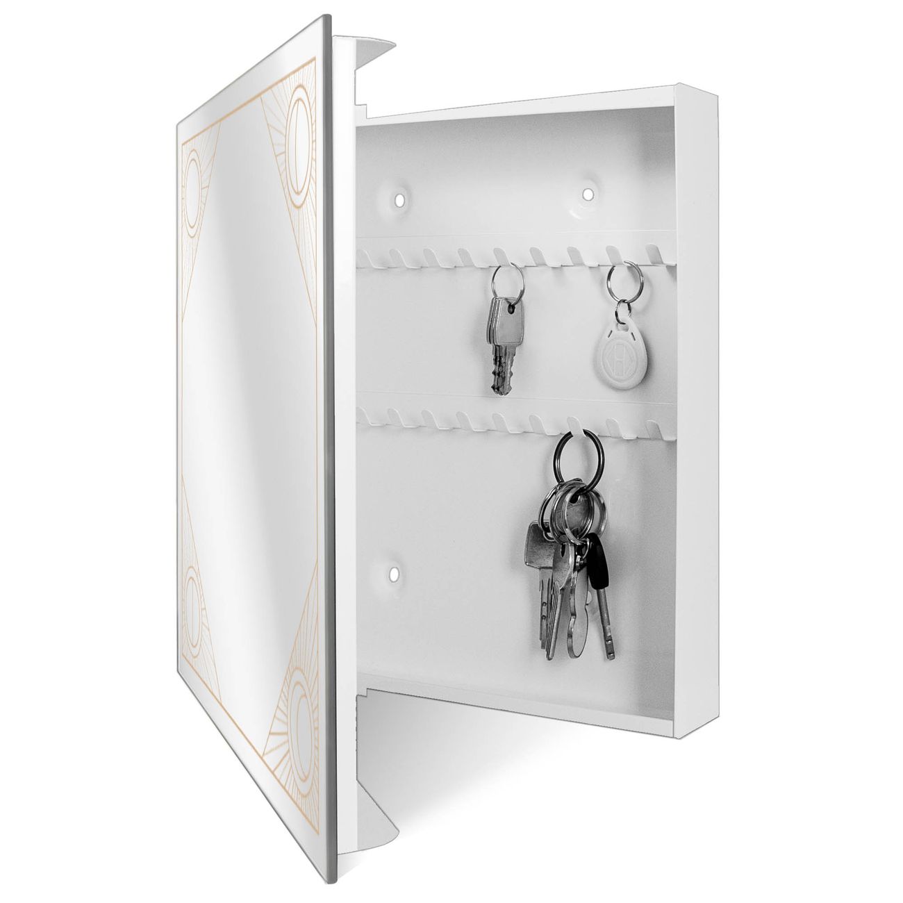 Bringe Ordnung und Stil in deinen Eingangsbereich mit dem banjado Schlüsselkasten mit Spiegel. Die elegante Spiegelfront kombiniert Funktionalität mit modernem Design und macht die Schlüsselaufbewahrung zu einem dekorativen Highlight. ✅ Spiegel Schlüsselaufbewahrung mit Motiv Motiv Sonnen- und Mondrahmen Der Design-Schlüsselkasten Motiv Motiv Sonnen- und Mondrahmen bietet Platz für bis zu 50 Schlüssel, die auf 5 stabilen Reihen mit je 10 Haken übersichtlich verstaut werden. Mit seinen kompakten Maßen von 30 x 30 x 5 cm passt die Schlüsselbox perfekt auch in kleinere Räume. Der weiß lackierte Stahlkorpus mit rechts angeschlagenem Türscharnier harmoniert mit der Spiegelfront und fügt sich nahtlos in jedes Wohnambiente ein. Ob als Schlüsselorganizer für Zuhause oder als praktische Lösung für Büros, Praxen und Gewerbe, der banjado Schlüsselkasten sorgt für Ordnung und Übersicht. Die Spiegelfront verleiht dem Eingangsbereich zusätzliche Funktionalität und lässt Räume optisch größer wirken. Die Schlüsselbox Motiv Motiv Sonnen- und Mondrahmen zur Wandmontage wird inklusive Befestigungsmaterial geliefert und ist schnell angebracht. So hast du deine Schlüssel jederzeit griffbereit und zugleich stilvoll verstaut. Mit diesem banjado Schlüsselkasten Motiv Motiv Sonnen- und Mondrahmen kombinierst du praktische Aufbewahrung mit stilvollem Wohndesign. Ob privat oder geschäftlich, die Schlüsselbox sorgt für mehr Ordnung, Übersicht und ein wohnliches Ambiente.Vorteile im Überblick
