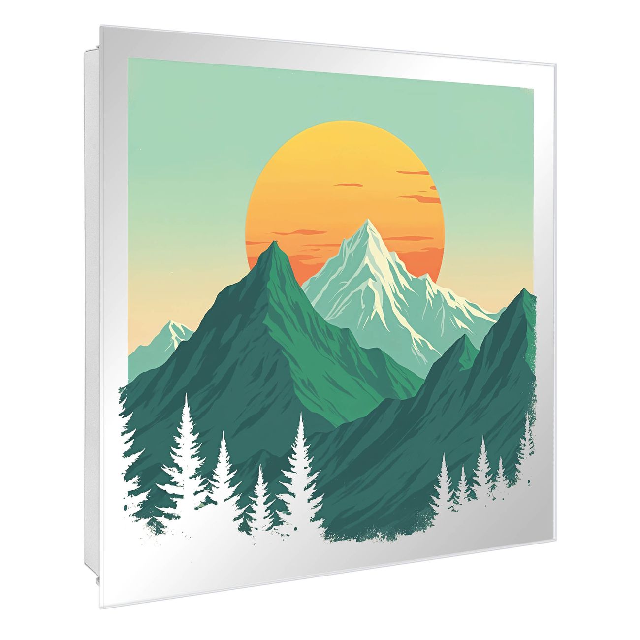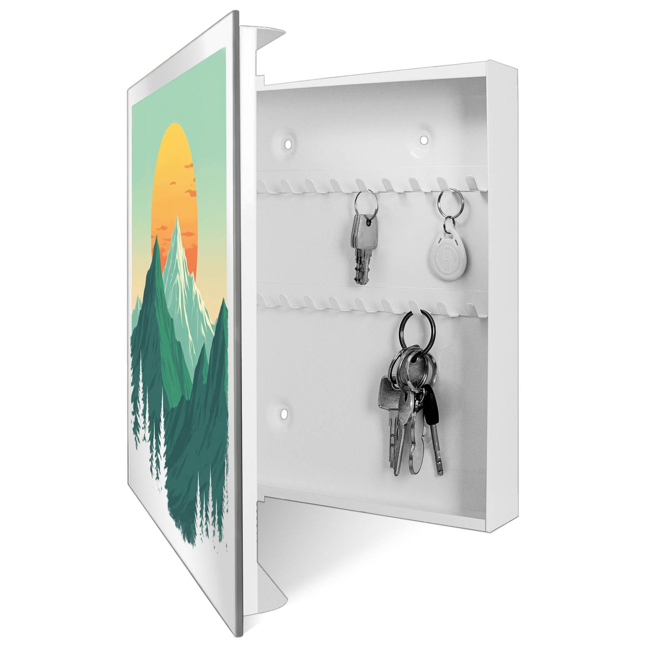 Bringe Ordnung und Stil in deinen Eingangsbereich mit dem banjado Schlüsselkasten mit Spiegel. Die elegante Spiegelfront kombiniert Funktionalität mit modernem Design und macht die Schlüsselaufbewahrung zu einem dekorativen Highlight. ✅ Spiegel Schlüsselaufbewahrung mit Motiv Motiv Sonnenaufgang über den Bergen Der Design-Schlüsselkasten Motiv Motiv Sonnenaufgang über den Bergen bietet Platz für bis zu 50 Schlüssel, die auf 5 stabilen Reihen mit je 10 Haken übersichtlich verstaut werden. Mit seinen kompakten Maßen von 30 x 30 x 5 cm passt die Schlüsselbox perfekt auch in kleinere Räume. Der weiß lackierte Stahlkorpus mit rechts angeschlagenem Türscharnier harmoniert mit der Spiegelfront und fügt sich nahtlos in jedes Wohnambiente ein. Ob als Schlüsselorganizer für Zuhause oder als praktische Lösung für Büros, Praxen und Gewerbe, der banjado Schlüsselkasten sorgt für Ordnung und Übersicht. Die Spiegelfront verleiht dem Eingangsbereich zusätzliche Funktionalität und lässt Räume optisch größer wirken. Die Schlüsselbox Motiv Motiv Sonnenaufgang über den Bergen zur Wandmontage wird inklusive Befestigungsmaterial geliefert und ist schnell angebracht. So hast du deine Schlüssel jederzeit griffbereit und zugleich stilvoll verstaut. Mit diesem banjado Schlüsselkasten Motiv Motiv Sonnenaufgang über den Bergen kombinierst du praktische Aufbewahrung mit stilvollem Wohndesign. Ob privat oder geschäftlich, die Schlüsselbox sorgt für mehr Ordnung, Übersicht und ein wohnliches Ambiente.Vorteile im Überblick