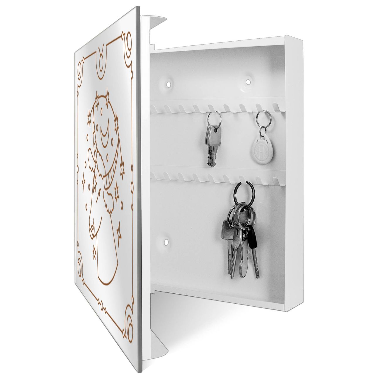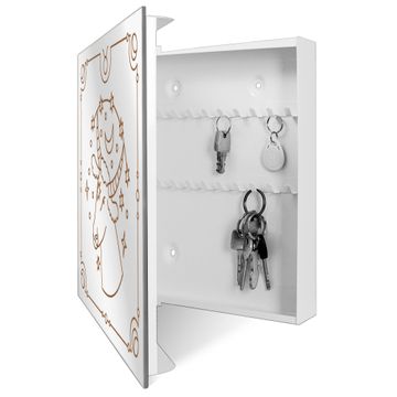 Bringe Ordnung und Stil in deinen Eingangsbereich mit dem banjado Schlüsselkasten mit Spiegel. Die elegante Spiegelfront kombiniert Funktionalität mit modernem Design und macht die Schlüsselaufbewahrung zu einem dekorativen Highlight. ✅ Spiegel Schlüsselaufbewahrung mit Motiv Motiv Sternzeichen Stier Der Design-Schlüsselkasten Motiv Motiv Sternzeichen Stier bietet Platz für bis zu 50 Schlüssel, die auf 5 stabilen Reihen mit je 10 Haken übersichtlich verstaut werden. Mit seinen kompakten Maßen von 30 x 30 x 5 cm passt die Schlüsselbox perfekt auch in kleinere Räume. Der weiß lackierte Stahlkorpus mit rechts angeschlagenem Türscharnier harmoniert mit der Spiegelfront und fügt sich nahtlos in jedes Wohnambiente ein. Ob als Schlüsselorganizer für Zuhause oder als praktische Lösung für Büros, Praxen und Gewerbe, der banjado Schlüsselkasten sorgt für Ordnung und Übersicht. Die Spiegelfront verleiht dem Eingangsbereich zusätzliche Funktionalität und lässt Räume optisch größer wirken. Die Schlüsselbox Motiv Motiv Sternzeichen Stier zur Wandmontage wird inklusive Befestigungsmaterial geliefert und ist schnell angebracht. So hast du deine Schlüssel jederzeit griffbereit und zugleich stilvoll verstaut. Mit diesem banjado Schlüsselkasten Motiv Motiv Sternzeichen Stier kombinierst du praktische Aufbewahrung mit stilvollem Wohndesign. Ob privat oder geschäftlich, die Schlüsselbox sorgt für mehr Ordnung, Übersicht und ein wohnliches Ambiente.Vorteile im Überblick