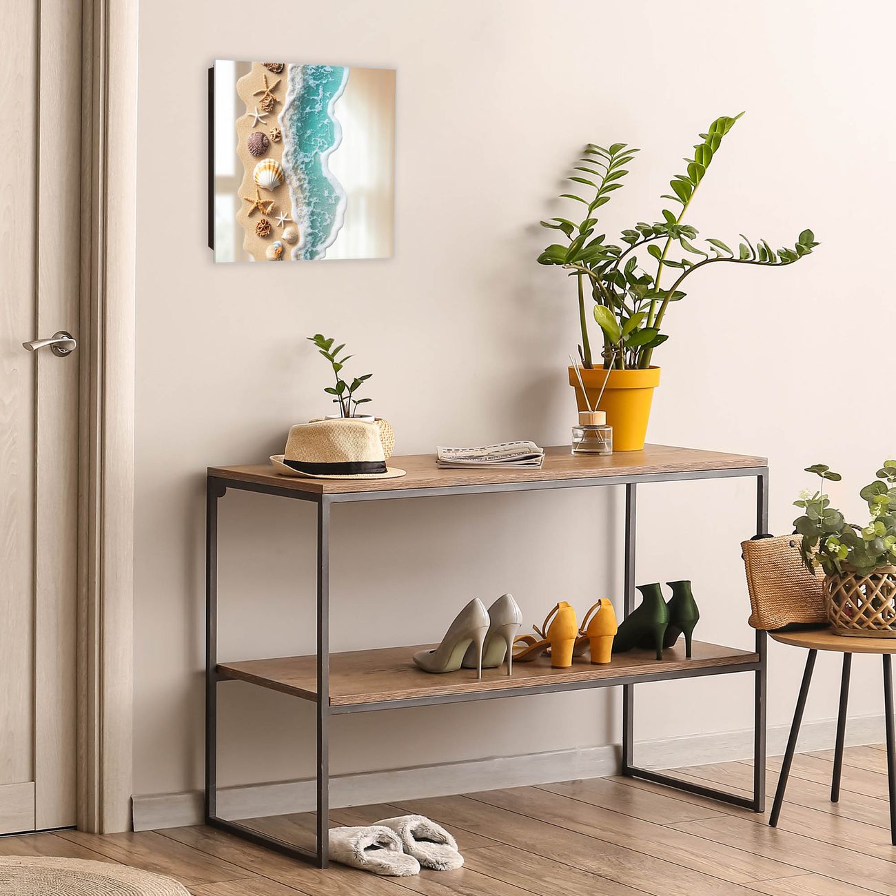 Bringe Ordnung und Stil in deinen Eingangsbereich mit dem banjado Schlüsselkasten mit Spiegel. Die elegante Spiegelfront kombiniert Funktionalität mit modernem Design und macht die Schlüsselaufbewahrung zu einem dekorativen Highlight. ✅ Spiegel Schlüsselaufbewahrung mit Motiv Motiv Strandparadies Der Design-Schlüsselkasten Motiv Motiv Strandparadies bietet Platz für bis zu 50 Schlüssel, die auf 5 stabilen Reihen mit je 10 Haken übersichtlich verstaut werden. Mit seinen kompakten Maßen von 30 x 30 x 5 cm passt die Schlüsselbox perfekt auch in kleinere Räume. Der schwarz lackierte Stahlkorpus mit rechts angeschlagenem Türscharnier harmoniert mit der Spiegelfront und fügt sich nahtlos in jedes Wohnambiente ein. Ob als Schlüsselorganizer für Zuhause oder als praktische Lösung für Büros, Praxen und Gewerbe, der banjado Schlüsselkasten sorgt für Ordnung und Übersicht. Die Spiegelfront verleiht dem Eingangsbereich zusätzliche Funktionalität und lässt Räume optisch größer wirken. Die Schlüsselbox Motiv Motiv Strandparadies zur Wandmontage wird inklusive Befestigungsmaterial geliefert und ist schnell angebracht. So hast du deine Schlüssel jederzeit griffbereit und zugleich stilvoll verstaut. Mit diesem banjado Schlüsselkasten Motiv Motiv Strandparadies kombinierst du praktische Aufbewahrung mit stilvollem Wohndesign. Ob privat oder geschäftlich, die Schlüsselbox sorgt für mehr Ordnung, Übersicht und ein wohnliches Ambiente.Vorteile im Überblick