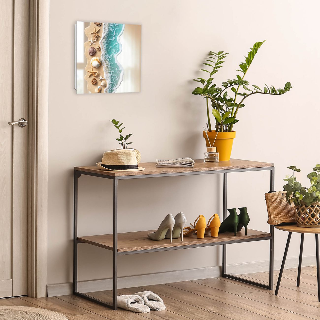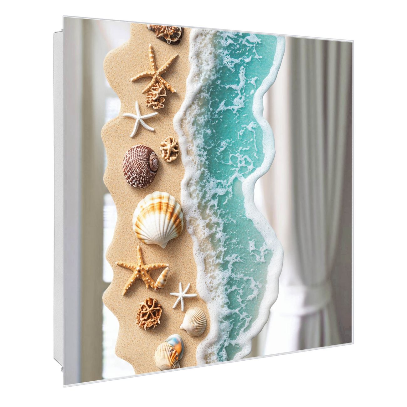 Bringe Ordnung und Stil in deinen Eingangsbereich mit dem banjado Schlüsselkasten mit Spiegel. Die elegante Spiegelfront kombiniert Funktionalität mit modernem Design und macht die Schlüsselaufbewahrung zu einem dekorativen Highlight. ✅ Spiegel Schlüsselaufbewahrung mit Motiv Motiv Strandparadies Der Design-Schlüsselkasten Motiv Motiv Strandparadies bietet Platz für bis zu 50 Schlüssel, die auf 5 stabilen Reihen mit je 10 Haken übersichtlich verstaut werden. Mit seinen kompakten Maßen von 30 x 30 x 5 cm passt die Schlüsselbox perfekt auch in kleinere Räume. Der weiß lackierte Stahlkorpus mit rechts angeschlagenem Türscharnier harmoniert mit der Spiegelfront und fügt sich nahtlos in jedes Wohnambiente ein. Ob als Schlüsselorganizer für Zuhause oder als praktische Lösung für Büros, Praxen und Gewerbe, der banjado Schlüsselkasten sorgt für Ordnung und Übersicht. Die Spiegelfront verleiht dem Eingangsbereich zusätzliche Funktionalität und lässt Räume optisch größer wirken. Die Schlüsselbox Motiv Motiv Strandparadies zur Wandmontage wird inklusive Befestigungsmaterial geliefert und ist schnell angebracht. So hast du deine Schlüssel jederzeit griffbereit und zugleich stilvoll verstaut. Mit diesem banjado Schlüsselkasten Motiv Motiv Strandparadies kombinierst du praktische Aufbewahrung mit stilvollem Wohndesign. Ob privat oder geschäftlich, die Schlüsselbox sorgt für mehr Ordnung, Übersicht und ein wohnliches Ambiente.Vorteile im Überblick