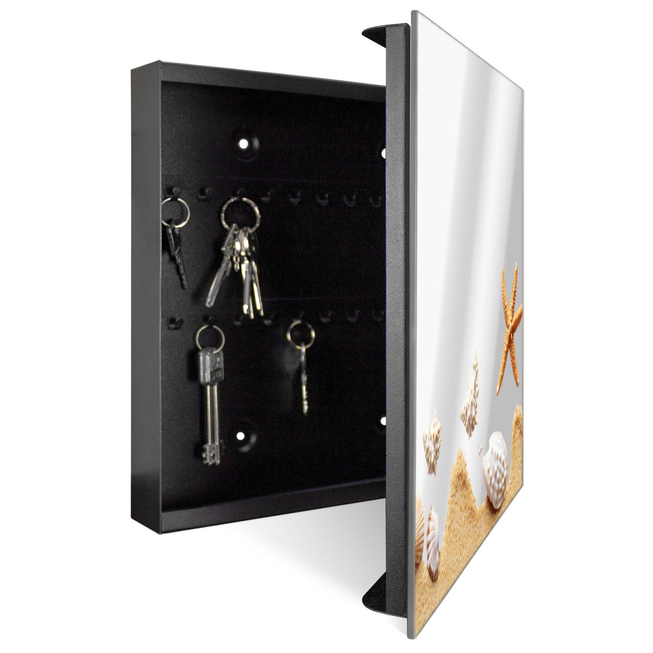 Bringe Ordnung und Stil in deinen Eingangsbereich mit dem banjado Schlüsselkasten mit Spiegel. Die elegante Spiegelfront kombiniert Funktionalität mit modernem Design und macht die Schlüsselaufbewahrung zu einem dekorativen Highlight. ✅ Spiegel Schlüsselaufbewahrung mit Motiv Motiv Strandzauber Der Design-Schlüsselkasten Motiv Motiv Strandzauber bietet Platz für bis zu 50 Schlüssel, die auf 5 stabilen Reihen mit je 10 Haken übersichtlich verstaut werden. Mit seinen kompakten Maßen von 30 x 30 x 5 cm passt die Schlüsselbox perfekt auch in kleinere Räume. Der schwarz lackierte Stahlkorpus mit rechts angeschlagenem Türscharnier harmoniert mit der Spiegelfront und fügt sich nahtlos in jedes Wohnambiente ein. Ob als Schlüsselorganizer für Zuhause oder als praktische Lösung für Büros, Praxen und Gewerbe, der banjado Schlüsselkasten sorgt für Ordnung und Übersicht. Die Spiegelfront verleiht dem Eingangsbereich zusätzliche Funktionalität und lässt Räume optisch größer wirken. Die Schlüsselbox Motiv Motiv Strandzauber zur Wandmontage wird inklusive Befestigungsmaterial geliefert und ist schnell angebracht. So hast du deine Schlüssel jederzeit griffbereit und zugleich stilvoll verstaut. Mit diesem banjado Schlüsselkasten Motiv Motiv Strandzauber kombinierst du praktische Aufbewahrung mit stilvollem Wohndesign. Ob privat oder geschäftlich, die Schlüsselbox sorgt für mehr Ordnung, Übersicht und ein wohnliches Ambiente.Vorteile im Überblick