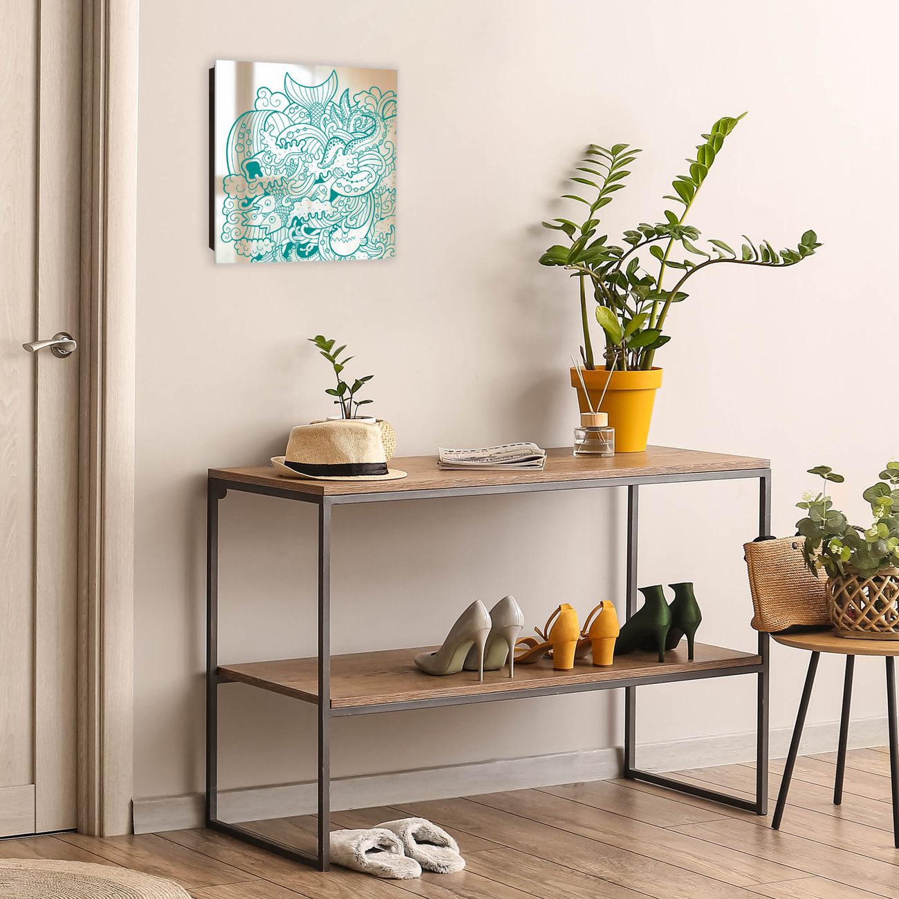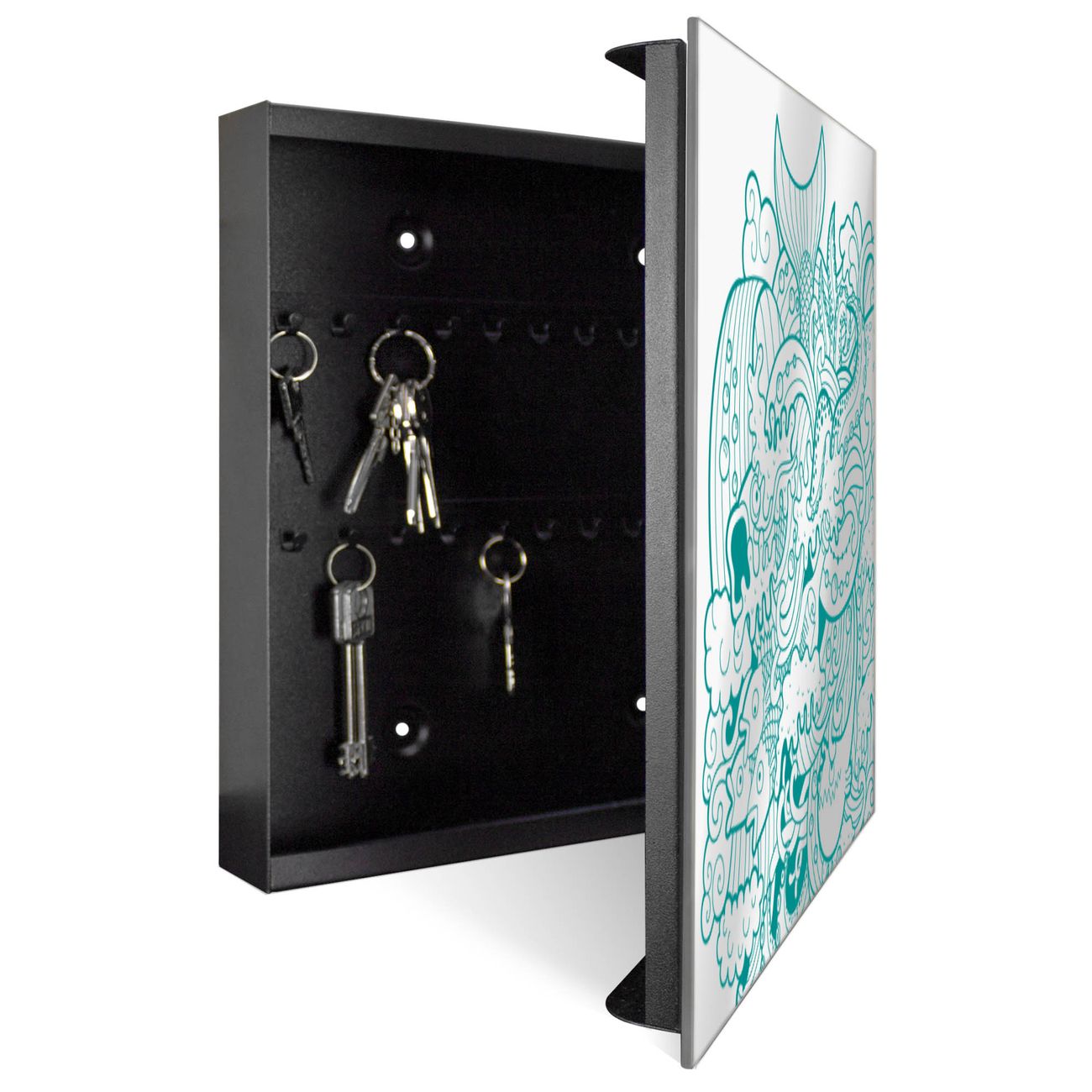 Bringe Ordnung und Stil in deinen Eingangsbereich mit dem banjado Schlüsselkasten mit Spiegel. Die elegante Spiegelfront kombiniert Funktionalität mit modernem Design und macht die Schlüsselaufbewahrung zu einem dekorativen Highlight. ✅ Spiegel Schlüsselaufbewahrung mit Motiv Motiv Tiefsee Der Design-Schlüsselkasten Motiv Motiv Tiefsee bietet Platz für bis zu 50 Schlüssel, die auf 5 stabilen Reihen mit je 10 Haken übersichtlich verstaut werden. Mit seinen kompakten Maßen von 30 x 30 x 5 cm passt die Schlüsselbox perfekt auch in kleinere Räume. Der schwarz lackierte Stahlkorpus mit rechts angeschlagenem Türscharnier harmoniert mit der Spiegelfront und fügt sich nahtlos in jedes Wohnambiente ein. Ob als Schlüsselorganizer für Zuhause oder als praktische Lösung für Büros, Praxen und Gewerbe, der banjado Schlüsselkasten sorgt für Ordnung und Übersicht. Die Spiegelfront verleiht dem Eingangsbereich zusätzliche Funktionalität und lässt Räume optisch größer wirken. Die Schlüsselbox Motiv Motiv Tiefsee zur Wandmontage wird inklusive Befestigungsmaterial geliefert und ist schnell angebracht. So hast du deine Schlüssel jederzeit griffbereit und zugleich stilvoll verstaut. Mit diesem banjado Schlüsselkasten Motiv Motiv Tiefsee kombinierst du praktische Aufbewahrung mit stilvollem Wohndesign. Ob privat oder geschäftlich, die Schlüsselbox sorgt für mehr Ordnung, Übersicht und ein wohnliches Ambiente.Vorteile im Überblick