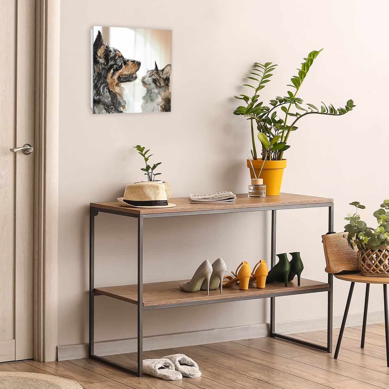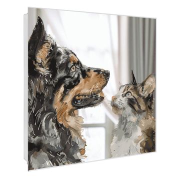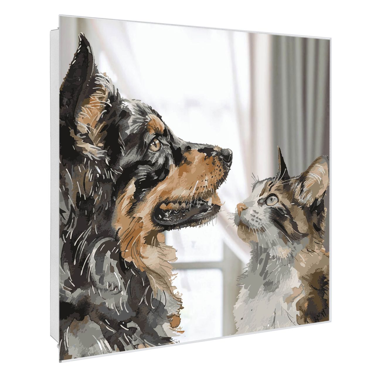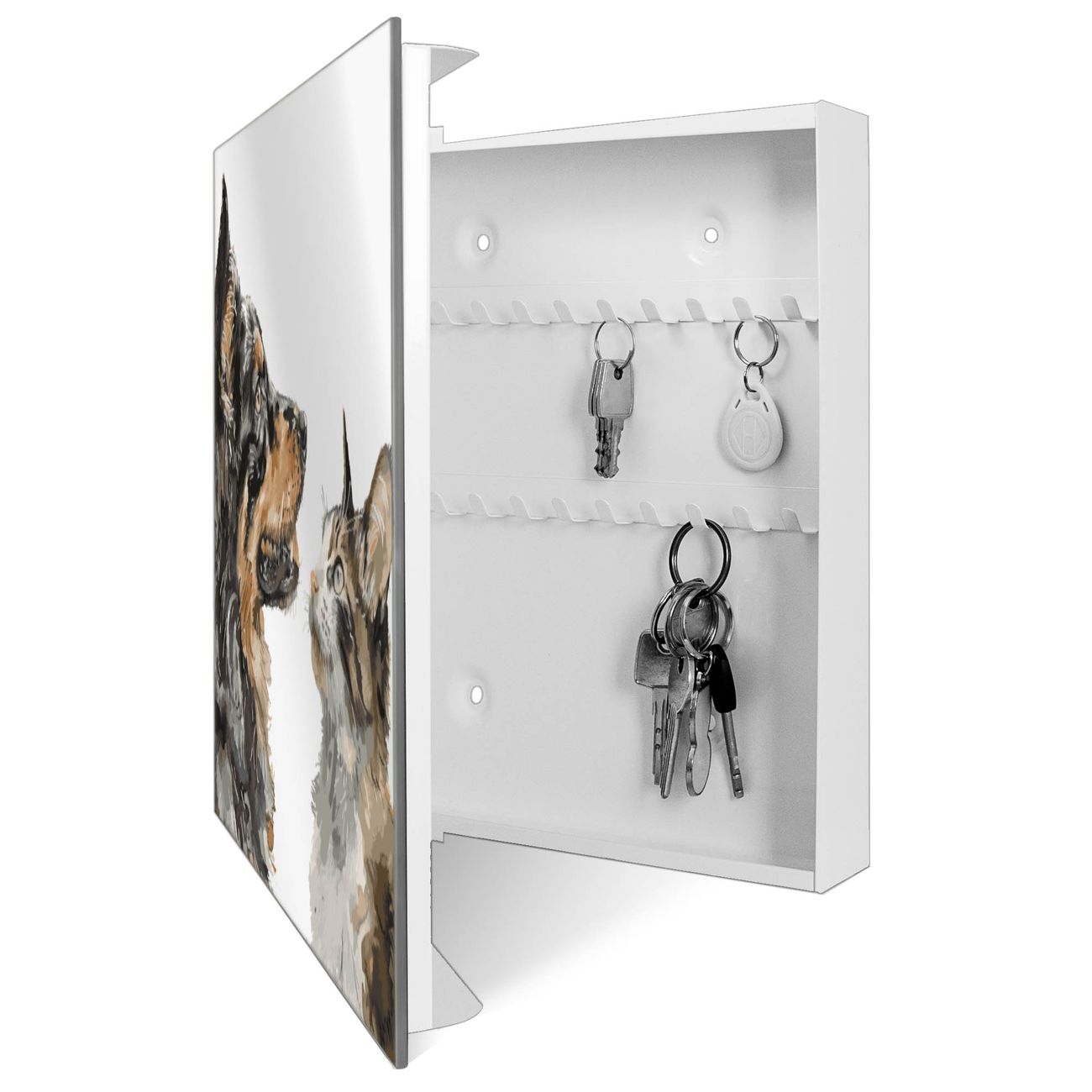 Bringe Ordnung und Stil in deinen Eingangsbereich mit dem banjado Schlüsselkasten mit Spiegel. Die elegante Spiegelfront kombiniert Funktionalität mit modernem Design und macht die Schlüsselaufbewahrung zu einem dekorativen Highlight. ✅ Spiegel Schlüsselaufbewahrung mit Motiv Motiv Tierische Begegnung Der Design-Schlüsselkasten Motiv Motiv Tierische Begegnung bietet Platz für bis zu 50 Schlüssel, die auf 5 stabilen Reihen mit je 10 Haken übersichtlich verstaut werden. Mit seinen kompakten Maßen von 30 x 30 x 5 cm passt die Schlüsselbox perfekt auch in kleinere Räume. Der weiß lackierte Stahlkorpus mit rechts angeschlagenem Türscharnier harmoniert mit der Spiegelfront und fügt sich nahtlos in jedes Wohnambiente ein. Ob als Schlüsselorganizer für Zuhause oder als praktische Lösung für Büros, Praxen und Gewerbe, der banjado Schlüsselkasten sorgt für Ordnung und Übersicht. Die Spiegelfront verleiht dem Eingangsbereich zusätzliche Funktionalität und lässt Räume optisch größer wirken. Die Schlüsselbox Motiv Motiv Tierische Begegnung zur Wandmontage wird inklusive Befestigungsmaterial geliefert und ist schnell angebracht. So hast du deine Schlüssel jederzeit griffbereit und zugleich stilvoll verstaut. Mit diesem banjado Schlüsselkasten Motiv Motiv Tierische Begegnung kombinierst du praktische Aufbewahrung mit stilvollem Wohndesign. Ob privat oder geschäftlich, die Schlüsselbox sorgt für mehr Ordnung, Übersicht und ein wohnliches Ambiente.Vorteile im Überblick
