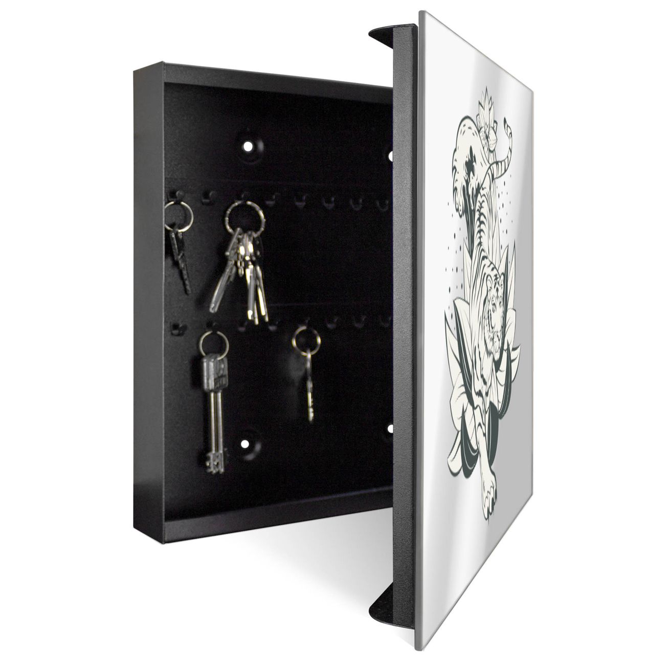 Bringe Ordnung und Stil in deinen Eingangsbereich mit dem banjado Schlüsselkasten mit Spiegel. Die elegante Spiegelfront kombiniert Funktionalität mit modernem Design und macht die Schlüsselaufbewahrung zu einem dekorativen Highlight. ✅ Spiegel Schlüsselaufbewahrung mit Motiv Motiv Tiger im Blumenmeer Der Design-Schlüsselkasten Motiv Motiv Tiger im Blumenmeer bietet Platz für bis zu 50 Schlüssel, die auf 5 stabilen Reihen mit je 10 Haken übersichtlich verstaut werden. Mit seinen kompakten Maßen von 30 x 30 x 5 cm passt die Schlüsselbox perfekt auch in kleinere Räume. Der schwarz lackierte Stahlkorpus mit rechts angeschlagenem Türscharnier harmoniert mit der Spiegelfront und fügt sich nahtlos in jedes Wohnambiente ein. Ob als Schlüsselorganizer für Zuhause oder als praktische Lösung für Büros, Praxen und Gewerbe, der banjado Schlüsselkasten sorgt für Ordnung und Übersicht. Die Spiegelfront verleiht dem Eingangsbereich zusätzliche Funktionalität und lässt Räume optisch größer wirken. Die Schlüsselbox Motiv Motiv Tiger im Blumenmeer zur Wandmontage wird inklusive Befestigungsmaterial geliefert und ist schnell angebracht. So hast du deine Schlüssel jederzeit griffbereit und zugleich stilvoll verstaut. Mit diesem banjado Schlüsselkasten Motiv Motiv Tiger im Blumenmeer kombinierst du praktische Aufbewahrung mit stilvollem Wohndesign. Ob privat oder geschäftlich, die Schlüsselbox sorgt für mehr Ordnung, Übersicht und ein wohnliches Ambiente.Vorteile im Überblick
