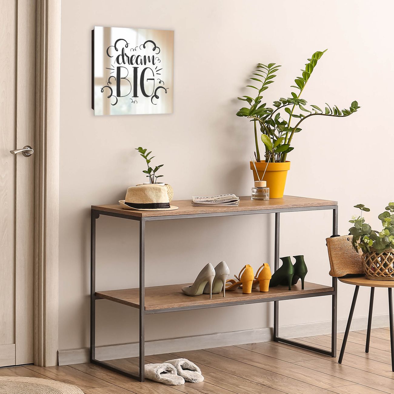 Bringe Ordnung und Stil in deinen Eingangsbereich mit dem banjado Schlüsselkasten mit Spiegel. Die elegante Spiegelfront kombiniert Funktionalität mit modernem Design und macht die Schlüsselaufbewahrung zu einem dekorativen Highlight. ✅ Spiegel Schlüsselaufbewahrung mit Motiv Motiv Traum Groß Der Design-Schlüsselkasten Motiv Motiv Traum Groß bietet Platz für bis zu 50 Schlüssel, die auf 5 stabilen Reihen mit je 10 Haken übersichtlich verstaut werden. Mit seinen kompakten Maßen von 30 x 30 x 5 cm passt die Schlüsselbox perfekt auch in kleinere Räume. Der schwarz lackierte Stahlkorpus mit rechts angeschlagenem Türscharnier harmoniert mit der Spiegelfront und fügt sich nahtlos in jedes Wohnambiente ein. Ob als Schlüsselorganizer für Zuhause oder als praktische Lösung für Büros, Praxen und Gewerbe, der banjado Schlüsselkasten sorgt für Ordnung und Übersicht. Die Spiegelfront verleiht dem Eingangsbereich zusätzliche Funktionalität und lässt Räume optisch größer wirken. Die Schlüsselbox Motiv Motiv Traum Groß zur Wandmontage wird inklusive Befestigungsmaterial geliefert und ist schnell angebracht. So hast du deine Schlüssel jederzeit griffbereit und zugleich stilvoll verstaut. Mit diesem banjado Schlüsselkasten Motiv Motiv Traum Groß kombinierst du praktische Aufbewahrung mit stilvollem Wohndesign. Ob privat oder geschäftlich, die Schlüsselbox sorgt für mehr Ordnung, Übersicht und ein wohnliches Ambiente.Vorteile im Überblick