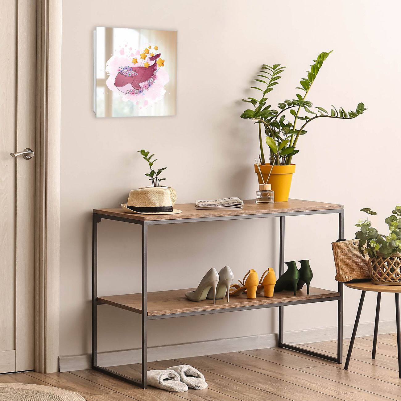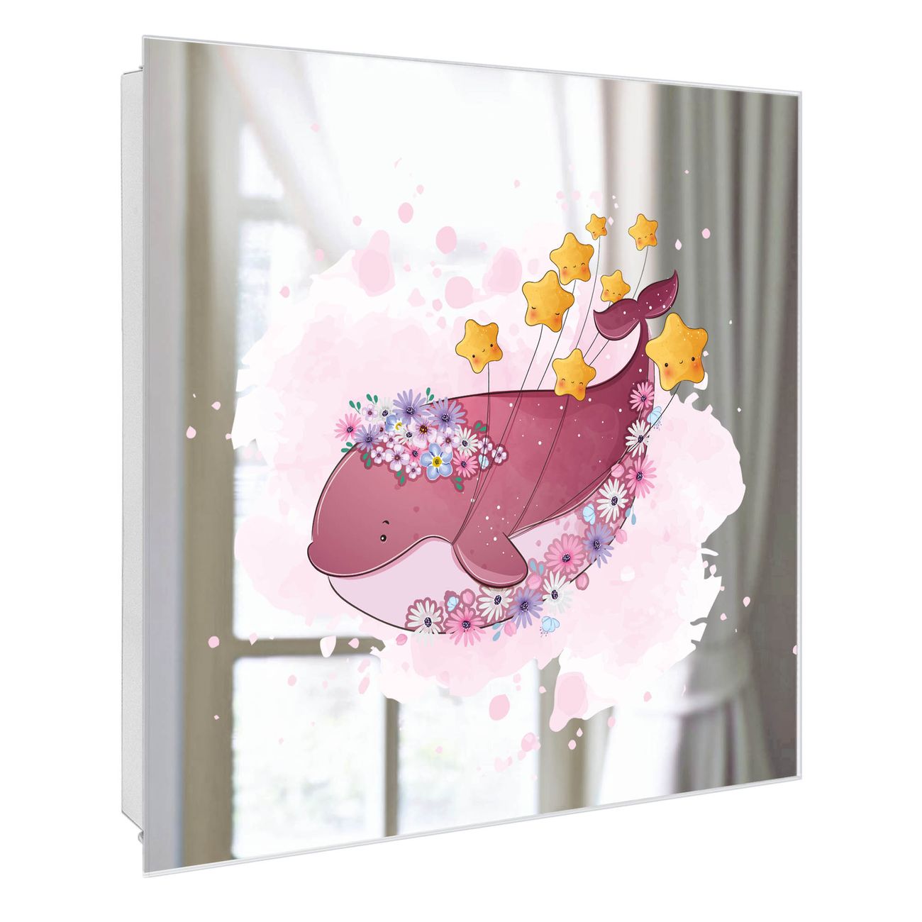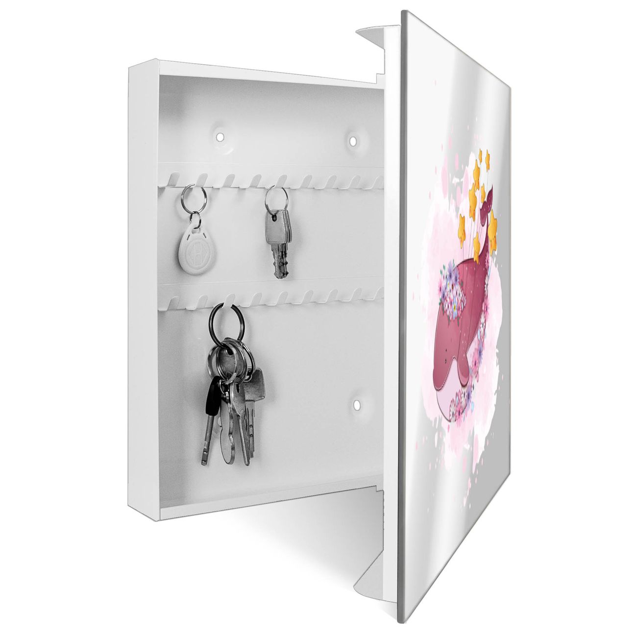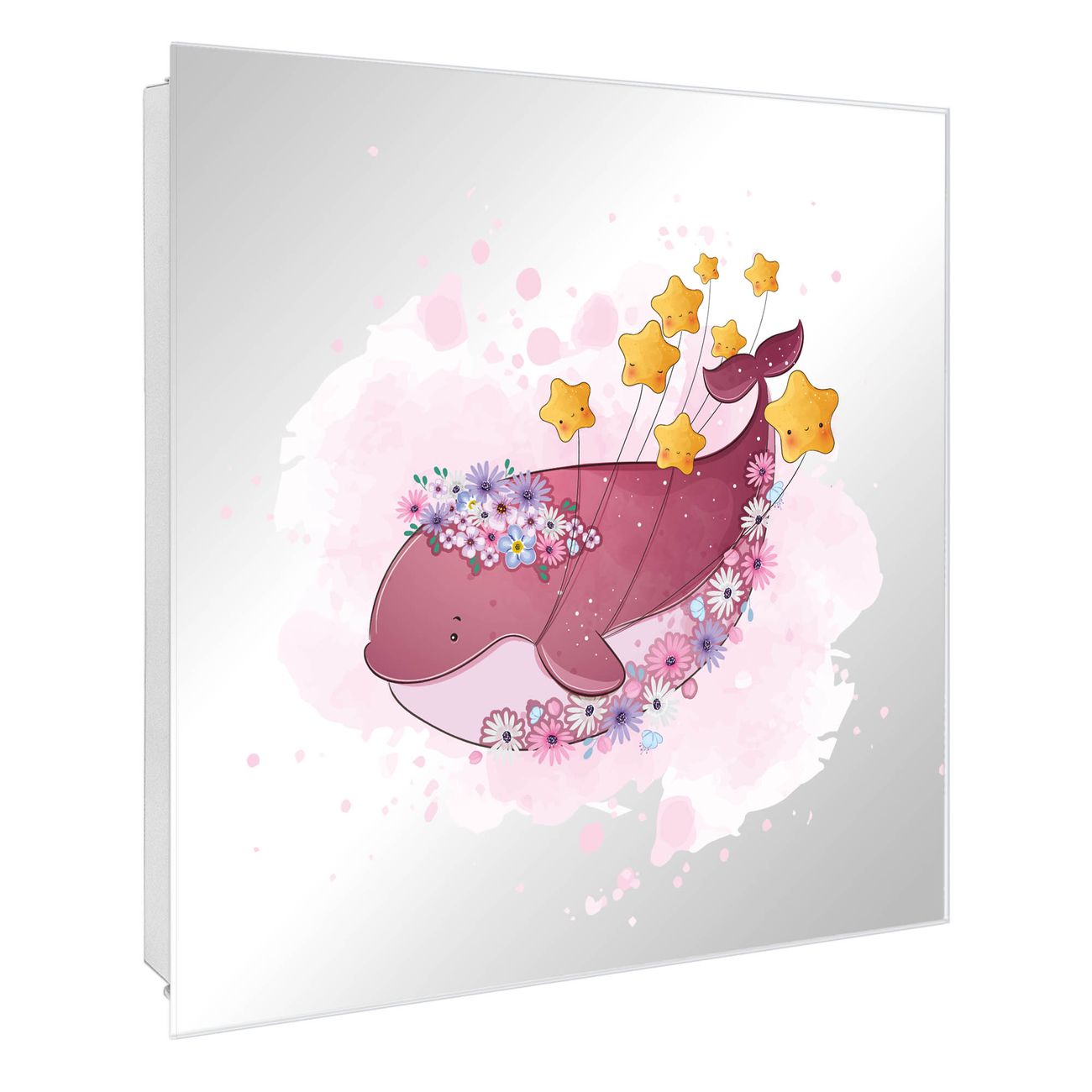 Bringe Ordnung und Stil in deinen Eingangsbereich mit dem banjado Schlüsselkasten mit Spiegel. Die elegante Spiegelfront kombiniert Funktionalität mit modernem Design und macht die Schlüsselaufbewahrung zu einem dekorativen Highlight. ✅ Spiegel Schlüsselaufbewahrung mit Motiv Motiv Traumwal mit Sternen Der Design-Schlüsselkasten Motiv Motiv Traumwal mit Sternen bietet Platz für bis zu 50 Schlüssel, die auf 5 stabilen Reihen mit je 10 Haken übersichtlich verstaut werden. Mit seinen kompakten Maßen von 30 x 30 x 5 cm passt die Schlüsselbox perfekt auch in kleinere Räume. Der weiß lackierte Stahlkorpus mit rechts angeschlagenem Türscharnier harmoniert mit der Spiegelfront und fügt sich nahtlos in jedes Wohnambiente ein. Ob als Schlüsselorganizer für Zuhause oder als praktische Lösung für Büros, Praxen und Gewerbe, der banjado Schlüsselkasten sorgt für Ordnung und Übersicht. Die Spiegelfront verleiht dem Eingangsbereich zusätzliche Funktionalität und lässt Räume optisch größer wirken. Die Schlüsselbox Motiv Motiv Traumwal mit Sternen zur Wandmontage wird inklusive Befestigungsmaterial geliefert und ist schnell angebracht. So hast du deine Schlüssel jederzeit griffbereit und zugleich stilvoll verstaut. Mit diesem banjado Schlüsselkasten Motiv Motiv Traumwal mit Sternen kombinierst du praktische Aufbewahrung mit stilvollem Wohndesign. Ob privat oder geschäftlich, die Schlüsselbox sorgt für mehr Ordnung, Übersicht und ein wohnliches Ambiente.Vorteile im Überblick